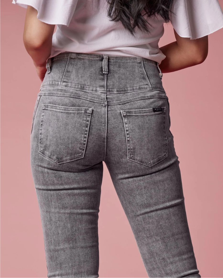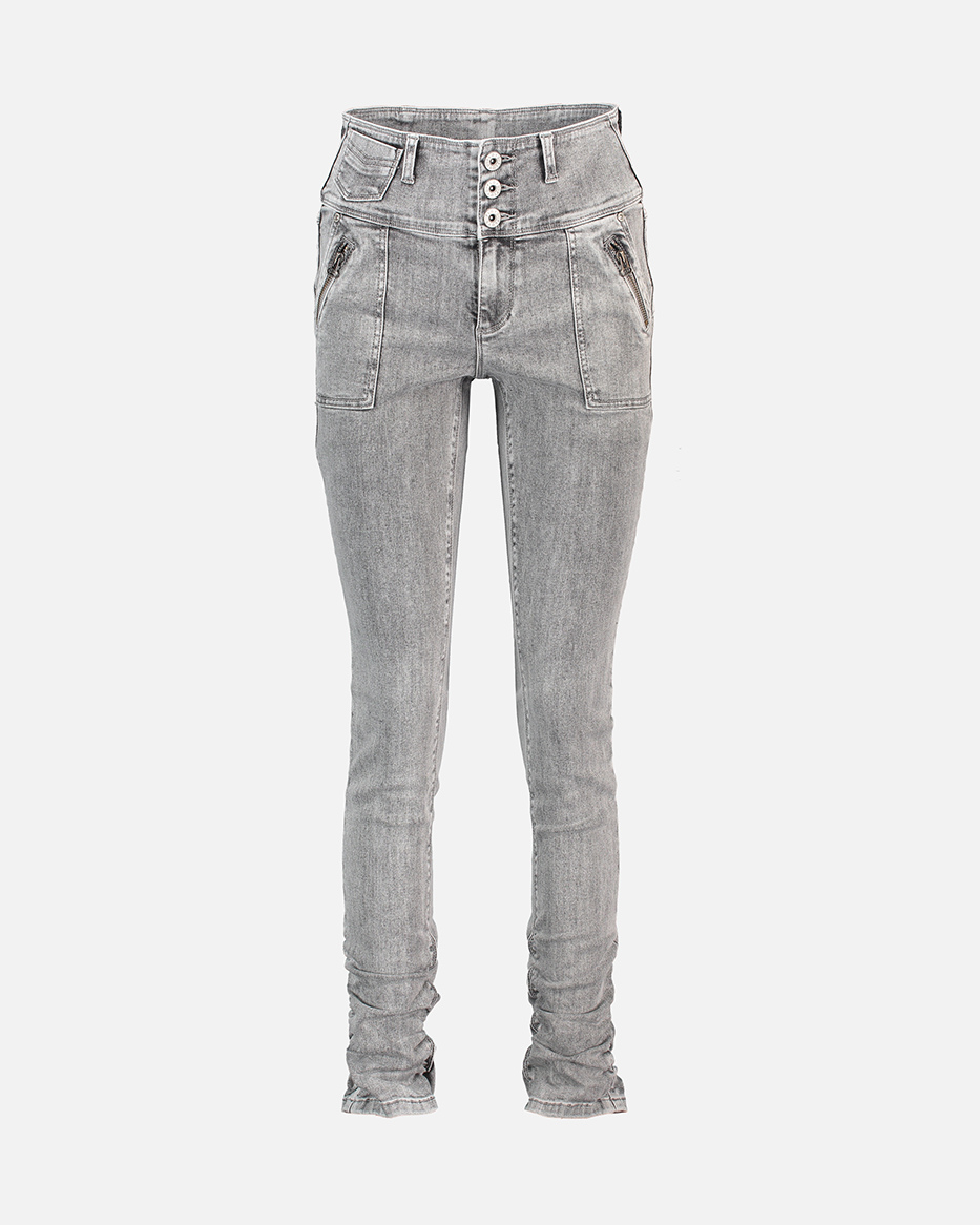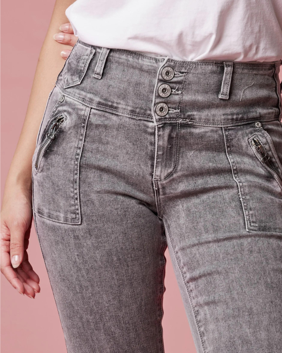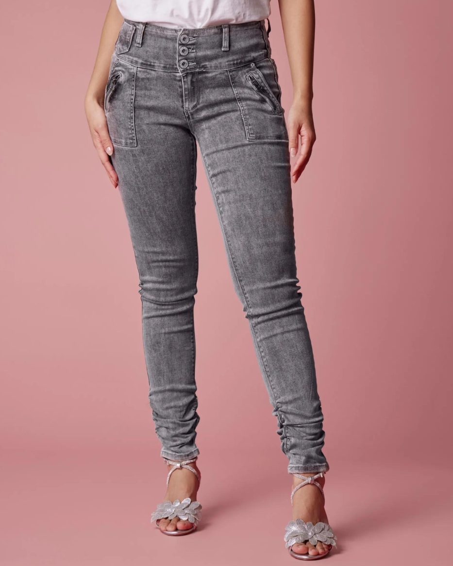 Buksemodellen Jessy har høyt liv, 3 knapper, og smal passform. Knappene foran er dekorert med imiterte diamanter. Dekorativ glidelås på lommene foran. Rynket elastikk nederst på bena. Baklommene er plassert midt på rumpa, som kan gi en illusjon av mindre rumpe.