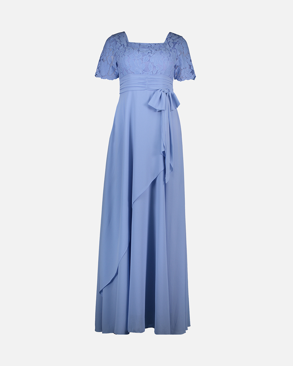 Gjør et elegant statement med vår lange selskapskjole i chiffon! Denne vakre kjolen har et skråskjært skjørt foran og pene draperte detaljer i chiffon i midjen, komplett med en delikat sløyfe på siden. Med en polstret overdel i blondestoff gir kjolen deg muligheten til å bruke den uten BH og opprettholde komforten hele dagen. Med et elastisk strikk i midjen, kun på baksiden, får du både stil og bevegelsesfrihet. Kjolen har en firkantet spennende utringing og korte ermer.