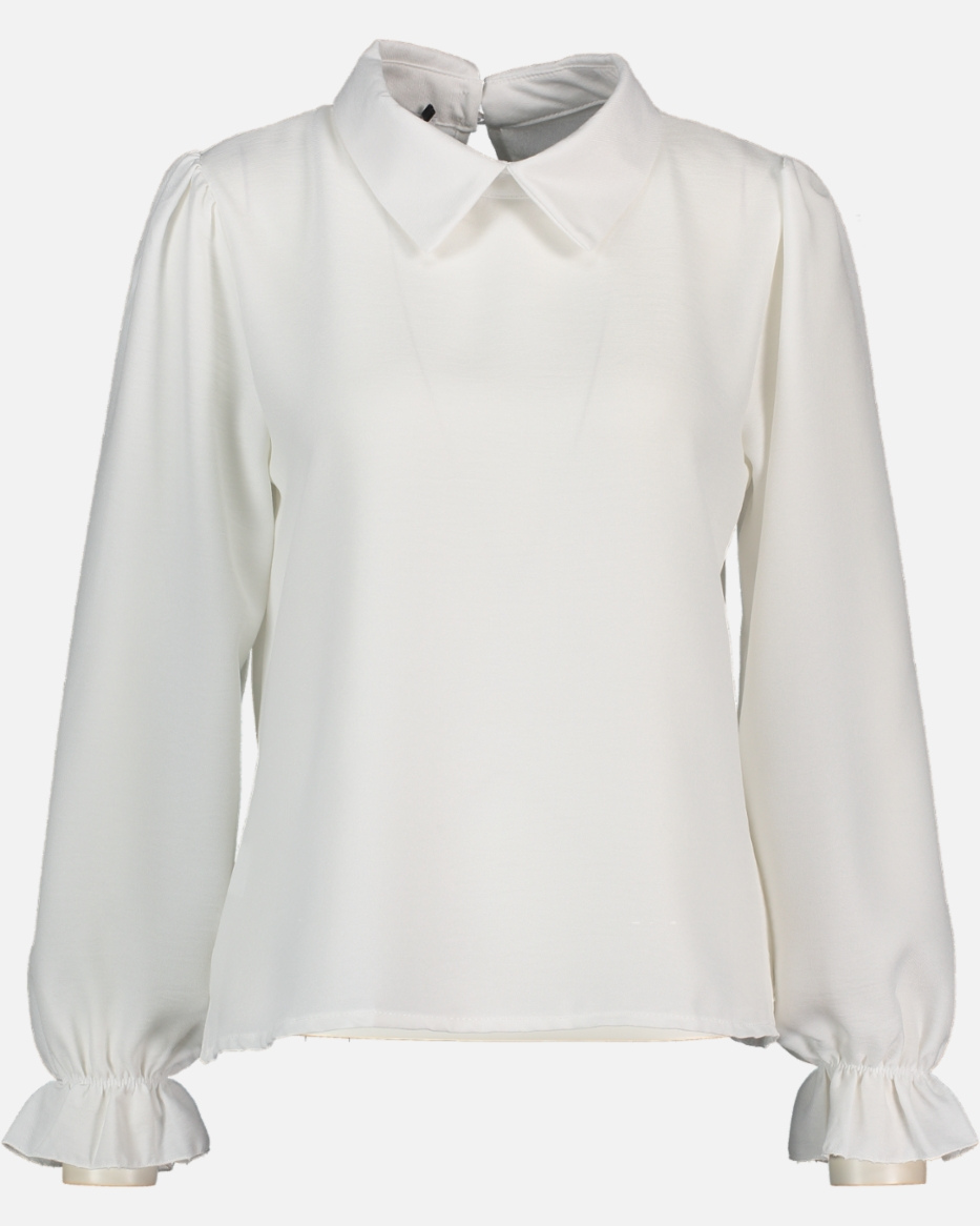 Denne tidløse blusen i grovt vevd kvalitet har en nydelig, teksturert overflate som gir antrekket det lille ekstra! Med klassisk skjortekrage og lange ermer med strikk og delikat volangkant, får du et feminint uttrykk med stil.