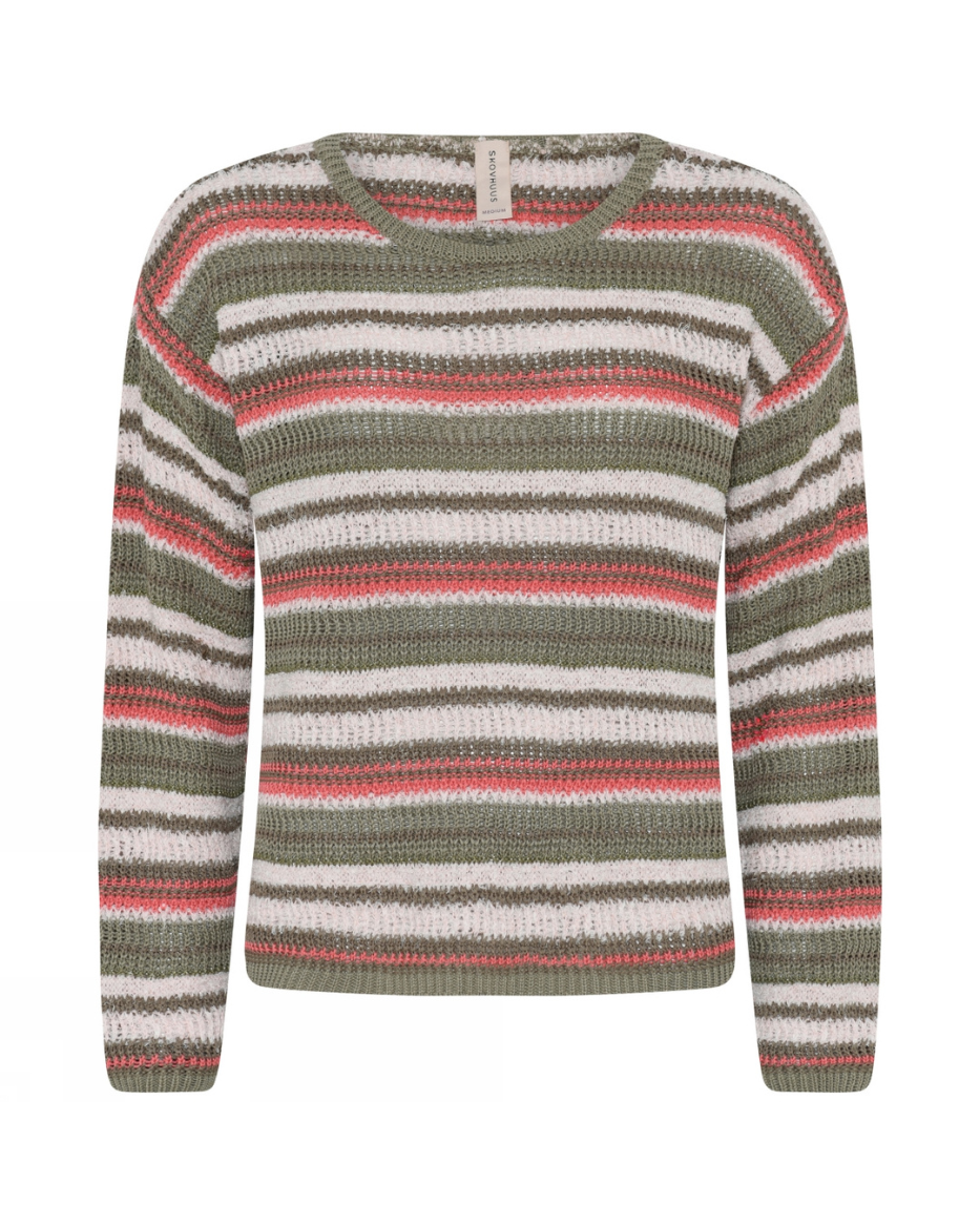 En unik strikkegenser med lekre striper i multifarger og forskjellige garnkvaliteter, inkludert små innslag av myk chenille. Rund hals og lange ermer gir et klassisk snitt, mens de ulike teksturene gjør genseren spennende og trendy. Perfekt til jeans, skjørt eller under jakke for en cozy og fargerik look.