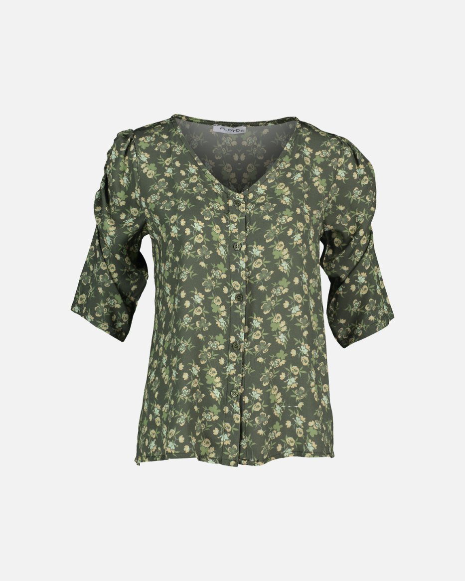 Donnie-toppen er laget i myk og behagelig viskose og har et feminint design med delikate blomsterdetaljer. De volumiøse 3/4-ermene med legg på skuldrene gir en lett puff-effekt og tilfører et moderne uttrykk.