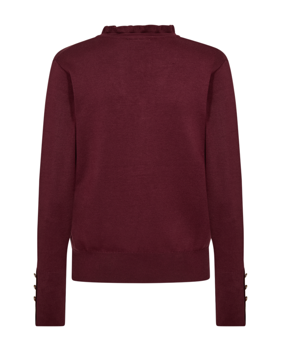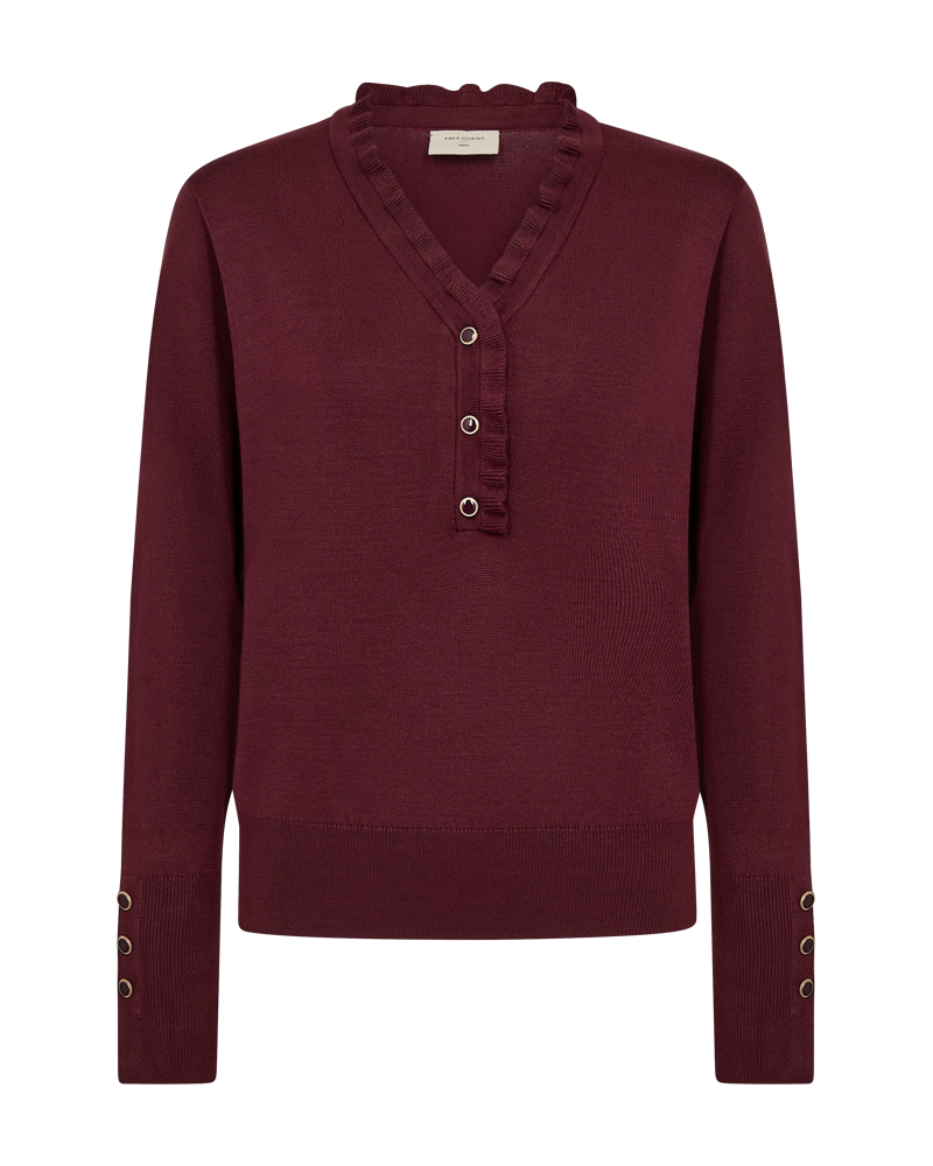 Laget i en myk og luksuriøs viskoseblanding, føles denne genseren behagelig mot huden hele dagen. Med en feminin v-hals med knapper og volang, rett passform, og elegante knapper nederst på ermene, gir den antrekket ditt et sofistikert og moderne preg.
