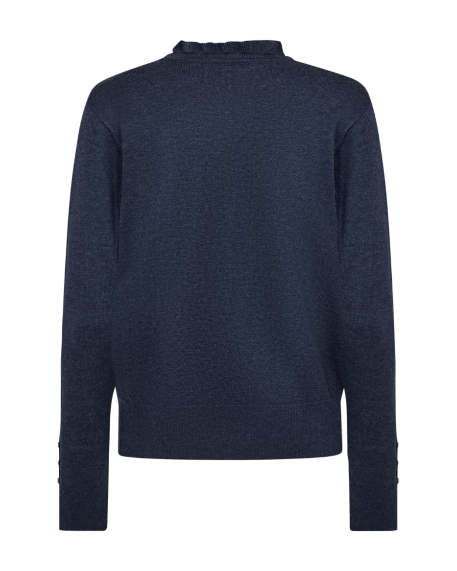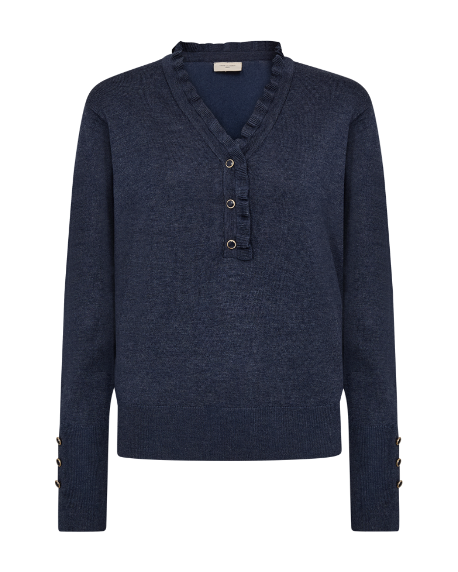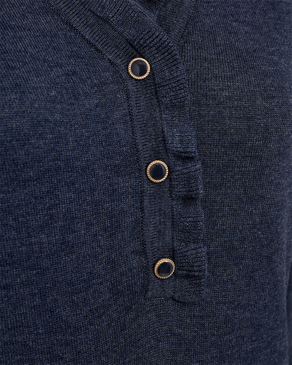 Laget i en myk og luksuriøs viskoseblanding, føles denne genseren behagelig mot huden hele dagen. Med en feminin v-hals med knapper og volang, rett passform, og elegante knapper nederst på ermene, gir den antrekket ditt et sofistikert og moderne preg.