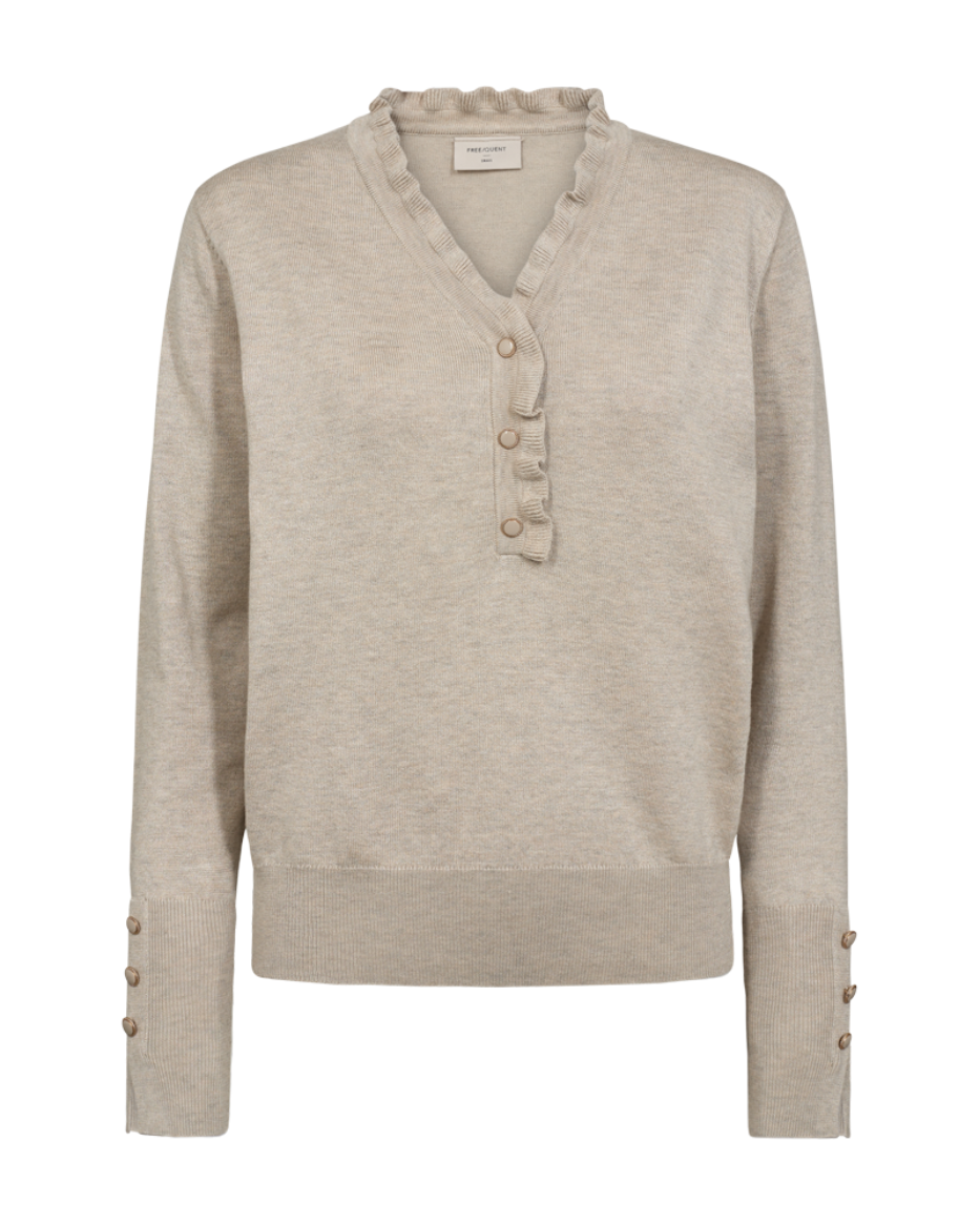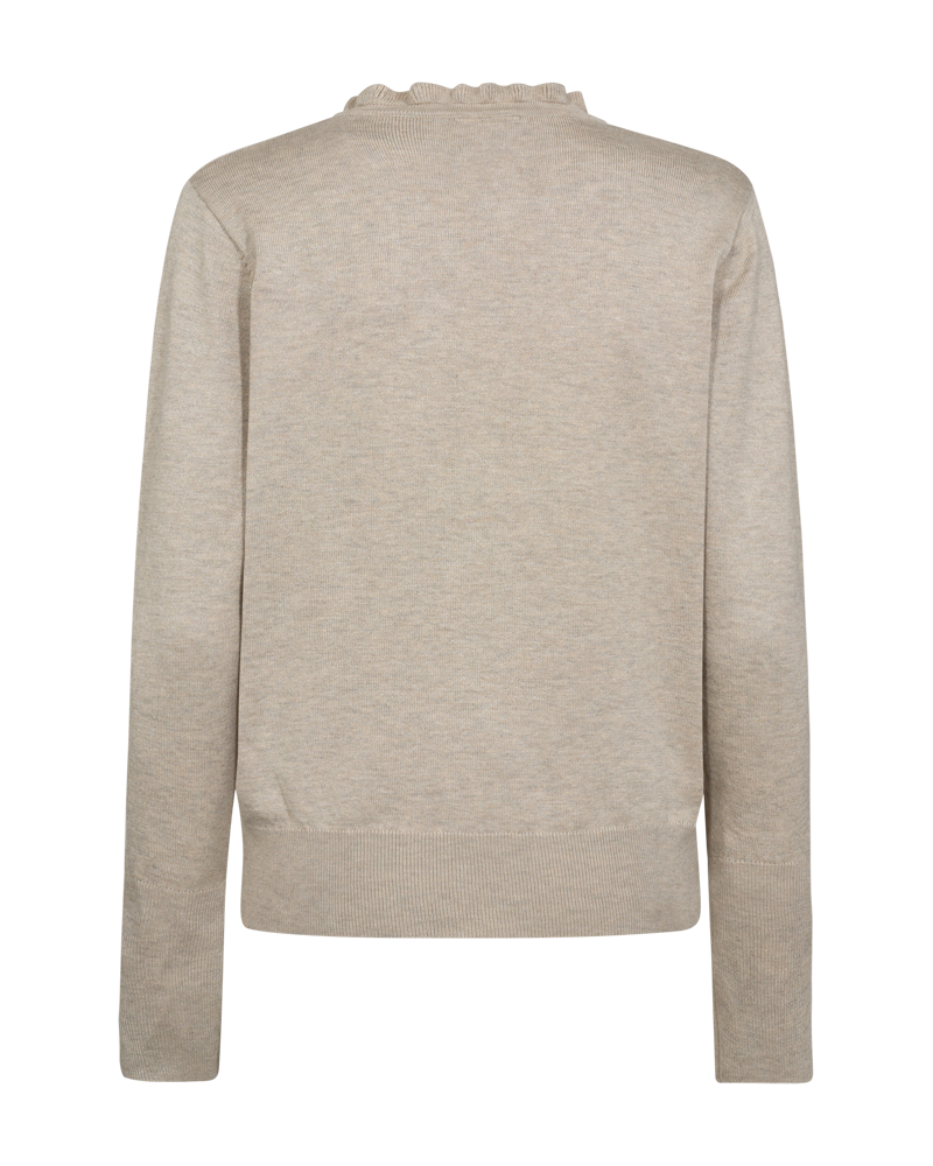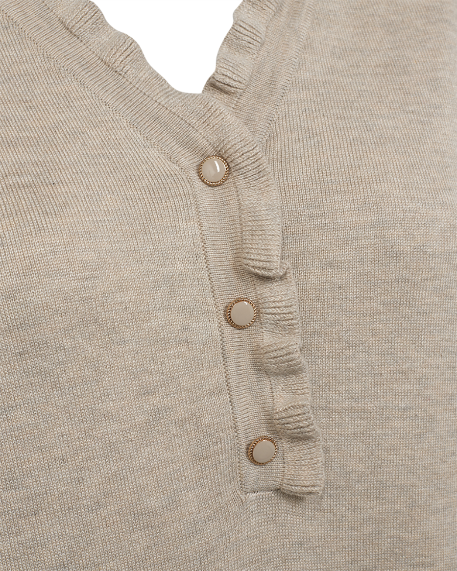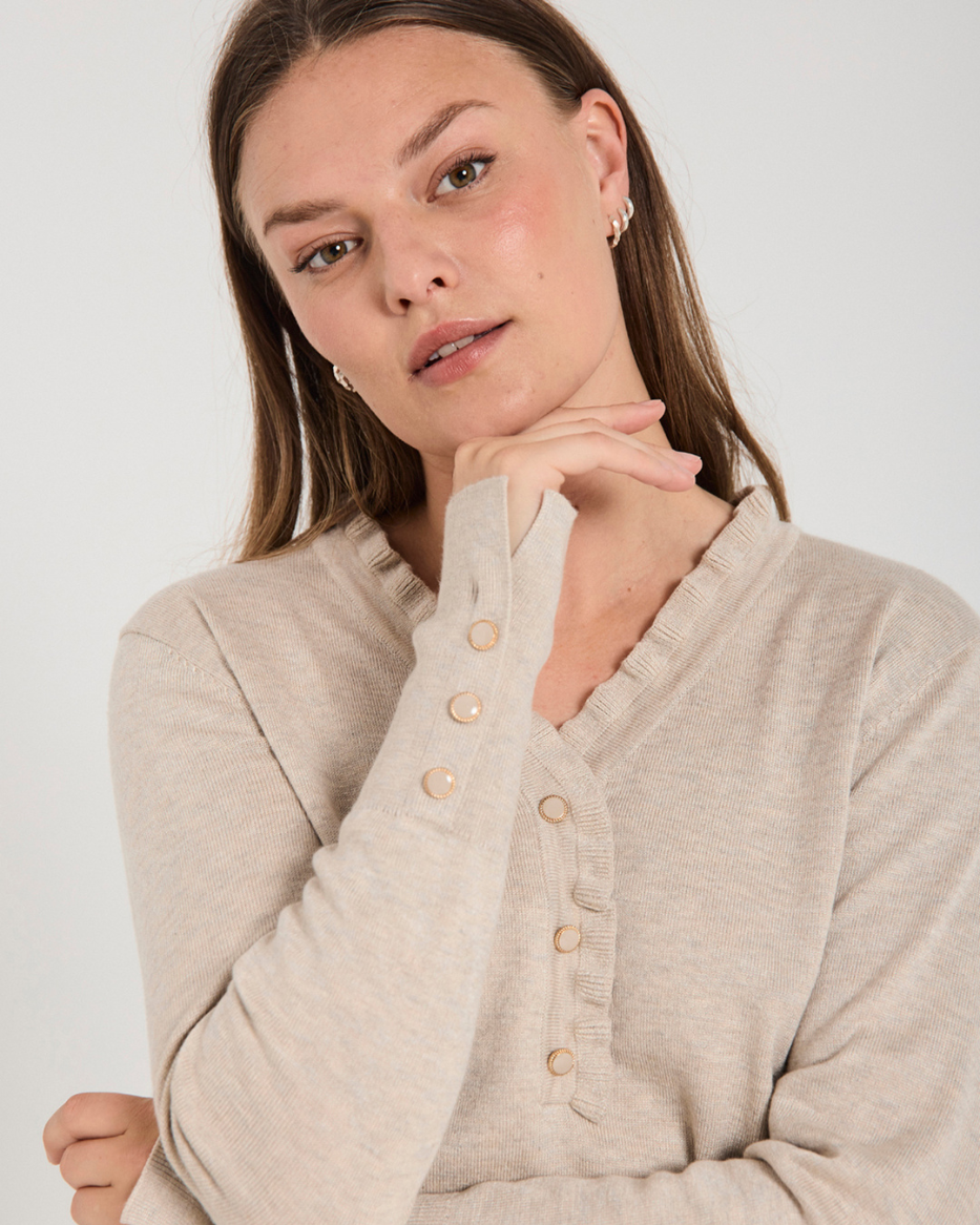 Laget i en myk og luksuriøs viskoseblanding, føles denne genseren behagelig mot huden hele dagen. Med en feminin v-hals med knapper og volang, rett passform, og elegante knapper nederst på ermene, gir den antrekket ditt et sofistikert og moderne preg.