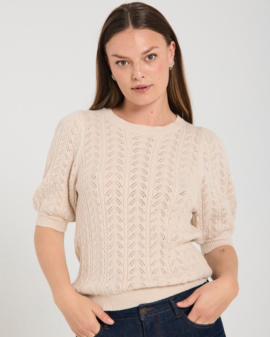 Denne deilige kortermede genseren i viskoseblanding er myk mot huden og gir et feminint preg til ethvert antrekk med sin runde hals, lette puffermer og tidløse strikket mønster.