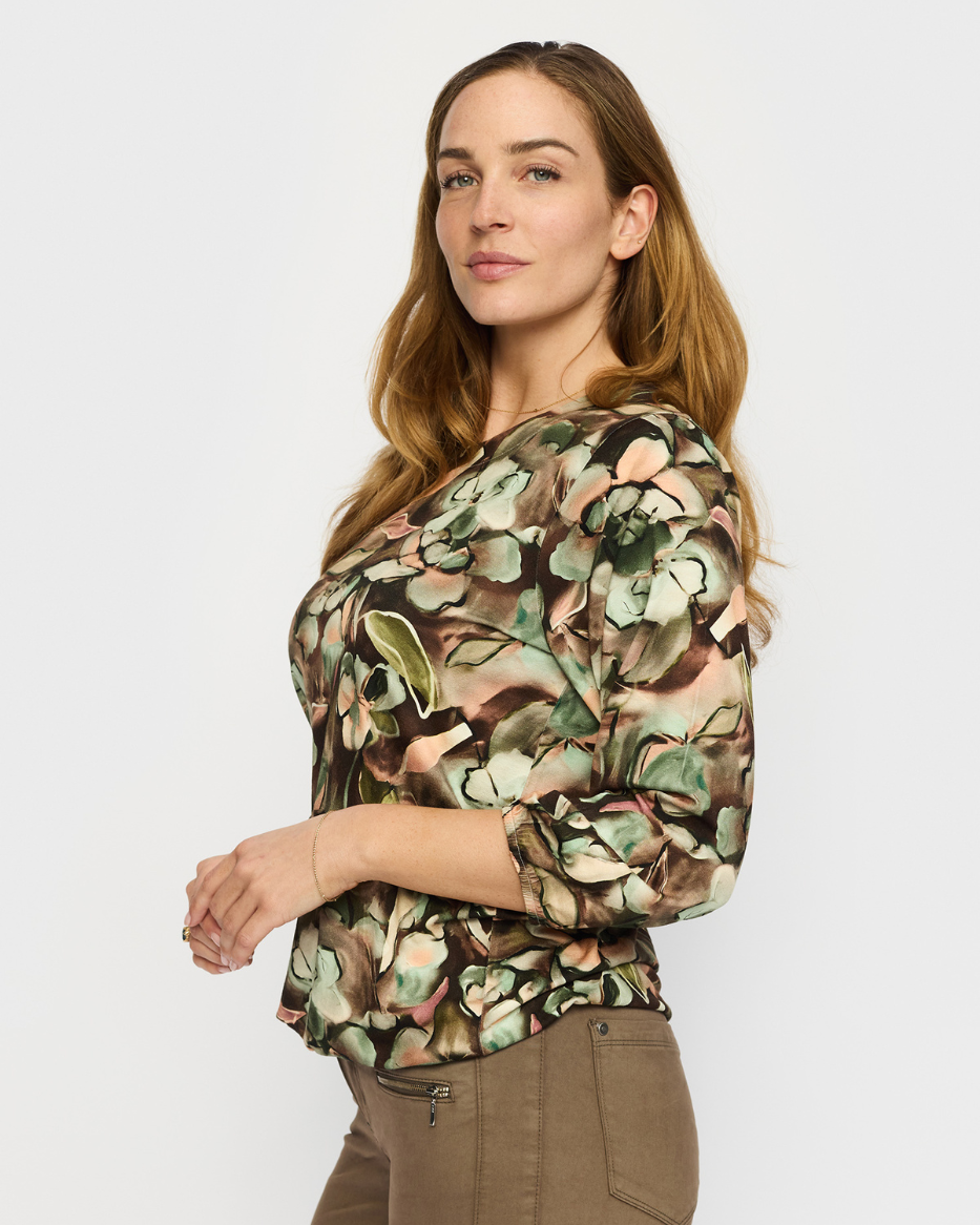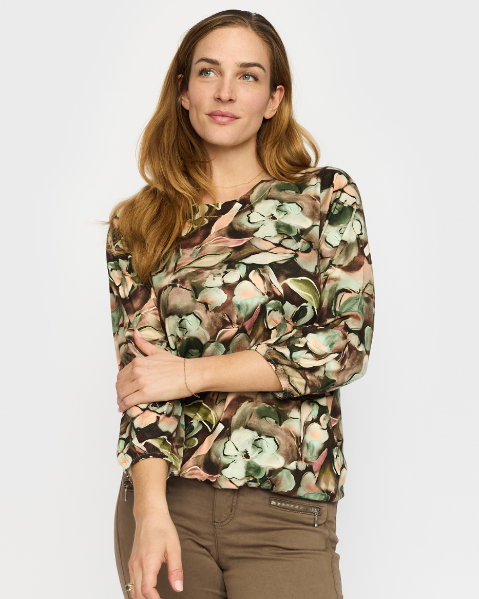 Oppdag vår komfortable og stilige topp laget i et mykt, elastisk materiale med et moderne mønster. Denne toppen har en rund hals som gir et klassisk og tidløst utseende. De lange ermene er utstyrt med strikk i kantene, noe som gjør det enkelt å tilpasse både lengde og passform etter behov. Den elastiske kvaliteten gir en perfekt passform som følger kroppens bevegelser, samtidig som det stilige mønsteret tilfører en trendy detalj. Perfekt for både hverdagsbruk og mer avslappede anledninger.