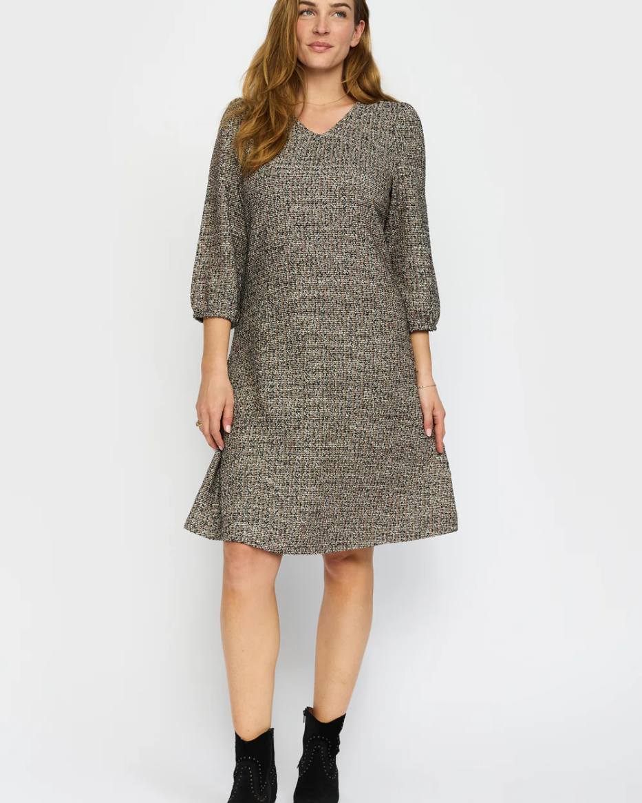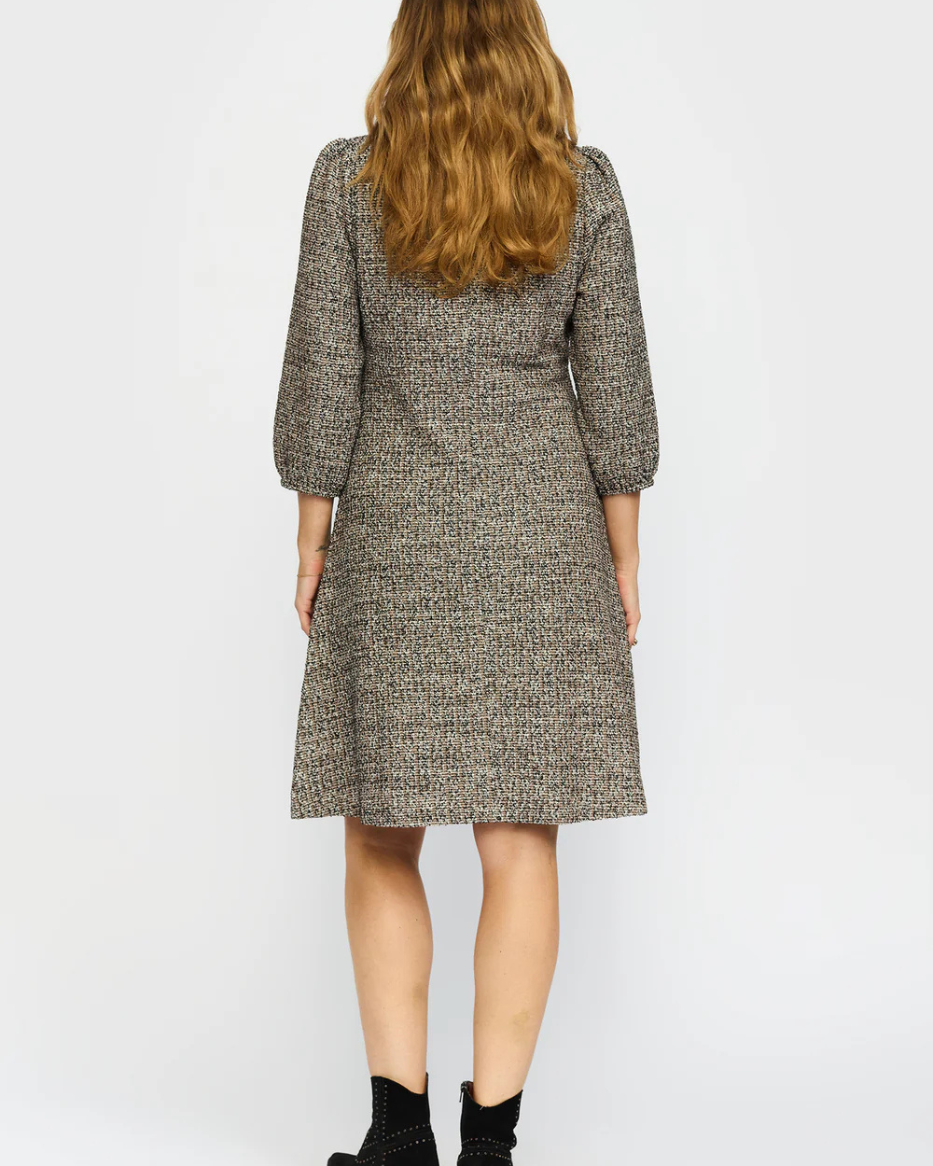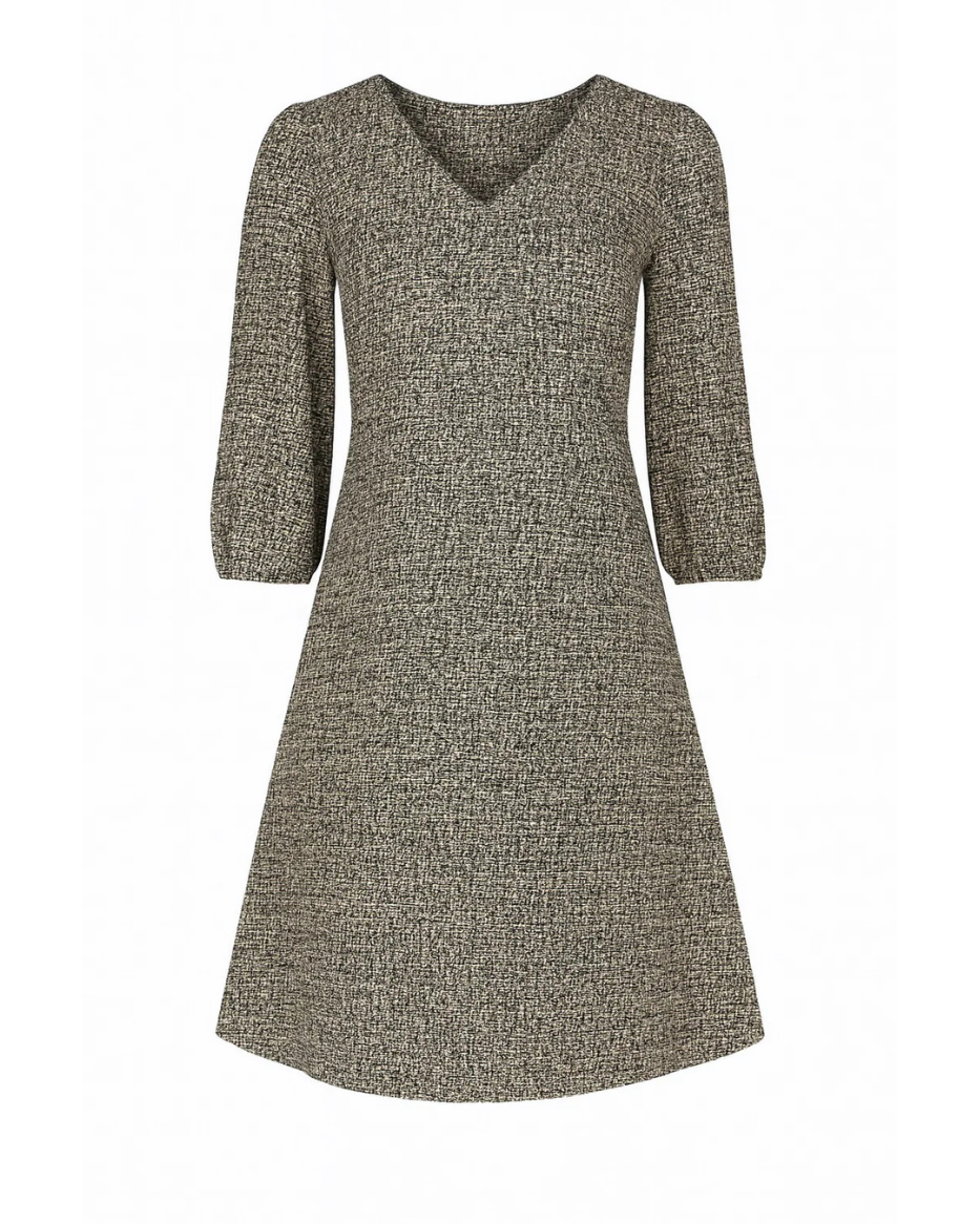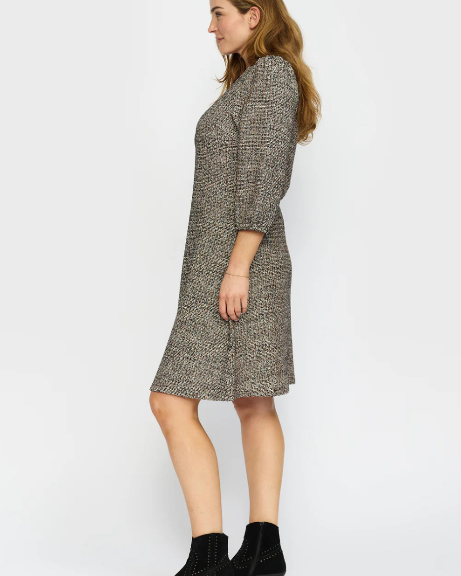 Oppdag Gia, en kort kjole i myk jersey/bouclé-kvalitet med et flott multi-farget mønster. Kjolen har knenlengde og A-fasong, som gir en feminin og flatterende silhuett.