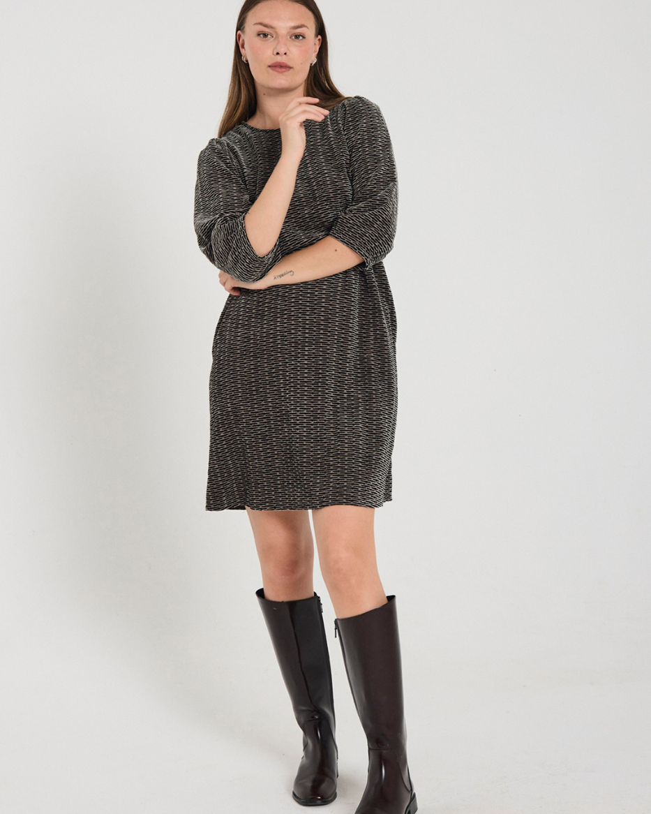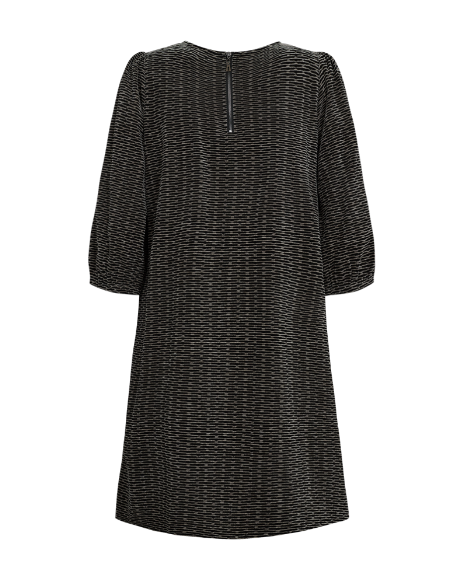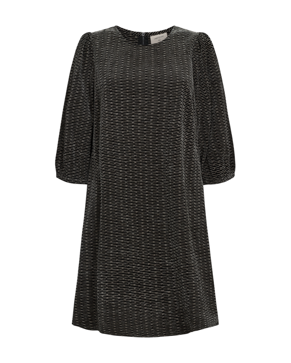 Mina er en kort kjole med et unikt designet mønster som gir en flott dybdeeffekt og et eksklusivt uttrykk. Den har en lett A-fasong som faller pent og gir en behagelig passform.