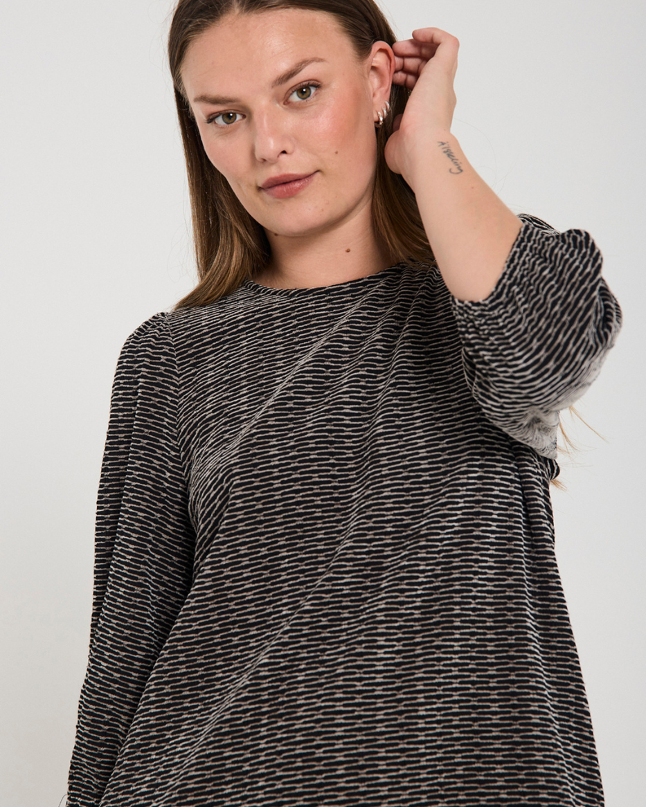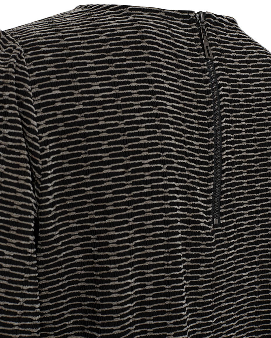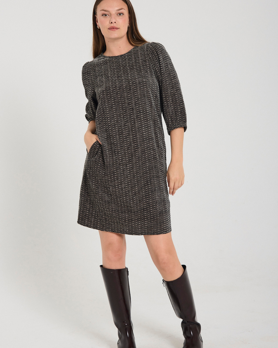 Mina er en kort kjole med et unikt designet mønster som gir en flott dybdeeffekt og et eksklusivt uttrykk. Den har en lett A-fasong som faller pent og gir en behagelig passform.