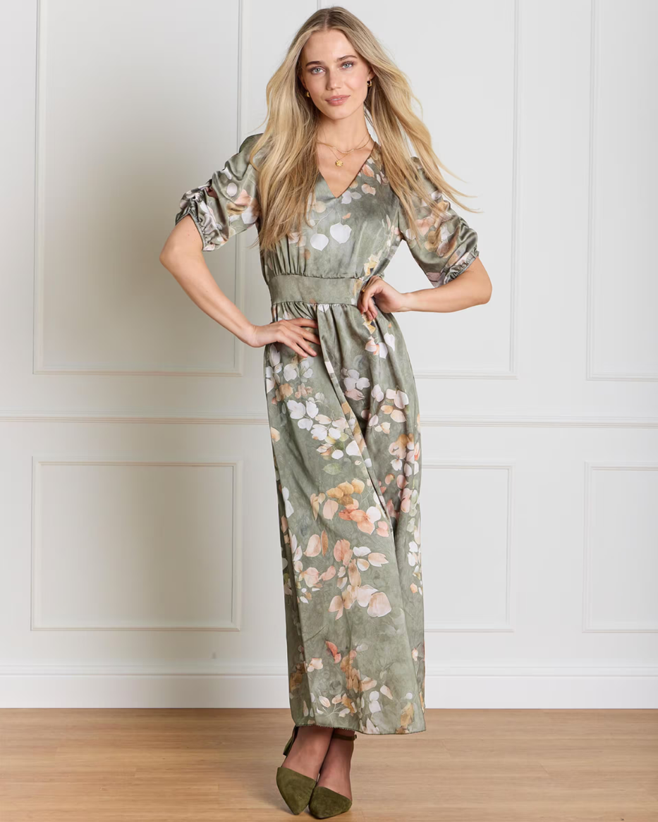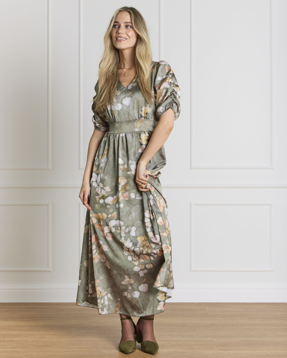 Emmeli lang kjole er en klassisk satengkjole som kombinerer tidløs eleganse med moderne detaljer. Den flatterende V-halsen og korte ermene med draperinger gir et feminint og sofistikert uttrykk, mens markert midje foran og elastisk strikk bak sikrer en behagelig og smigrende passform.