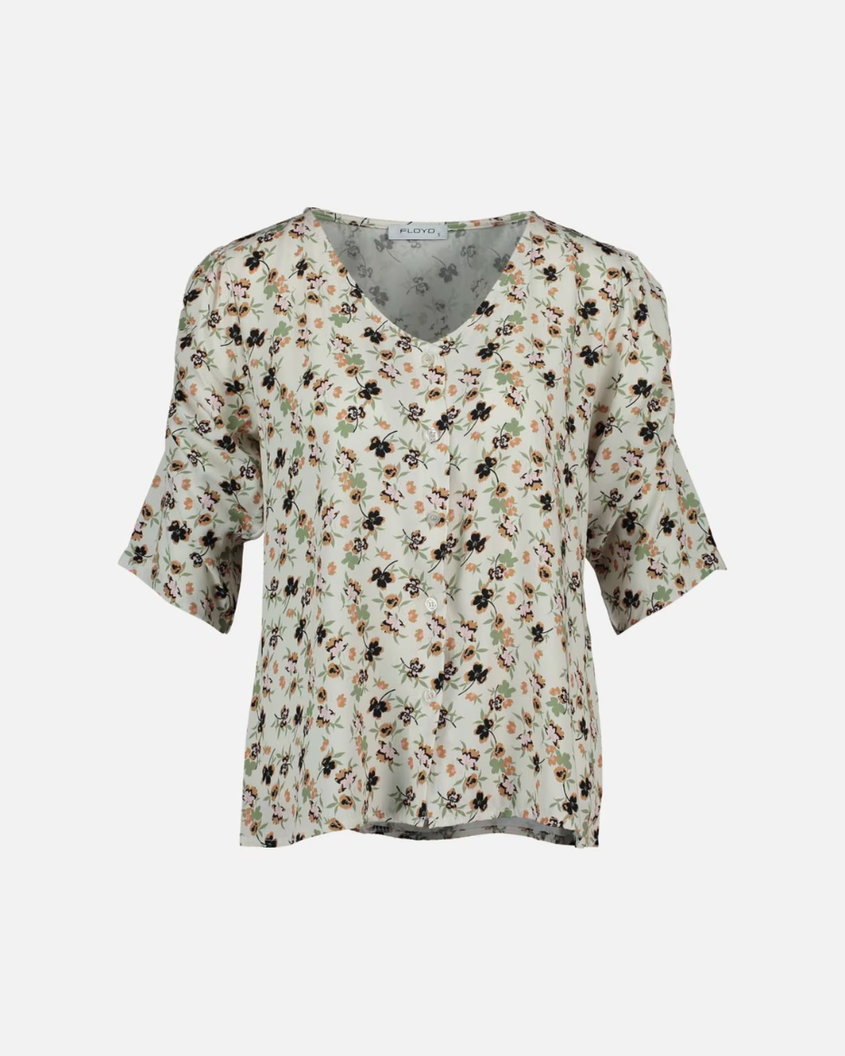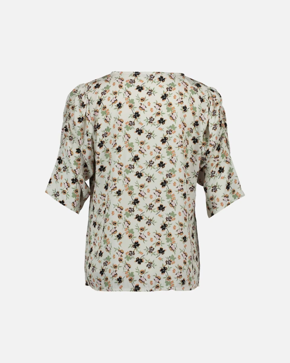 Donnie-toppen er laget i myk og behagelig viskose og har et feminint design med delikate blomsterdetaljer. De volumiøse 3/4-ermene med legg på skuldrene gir en lett puff-effekt og tilfører et moderne uttrykk.