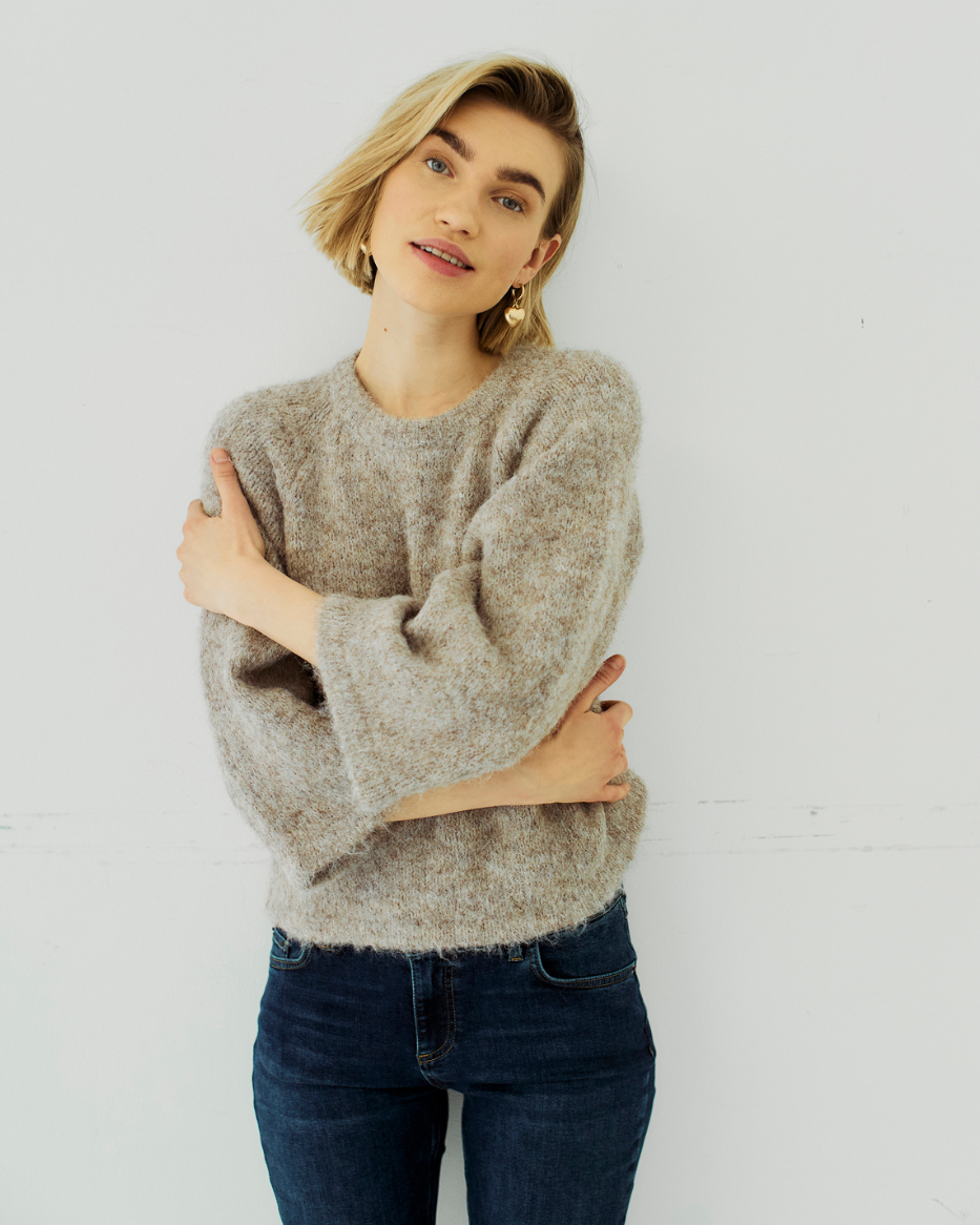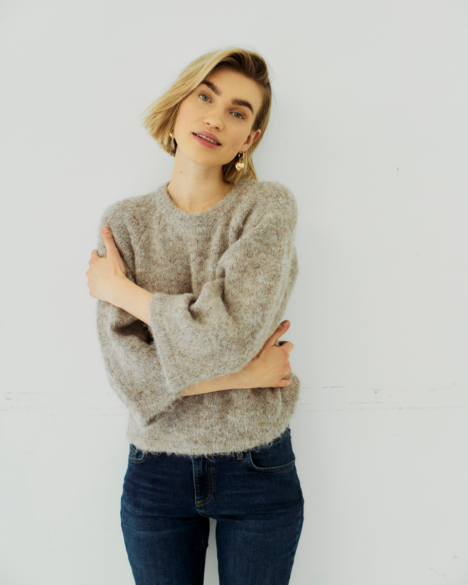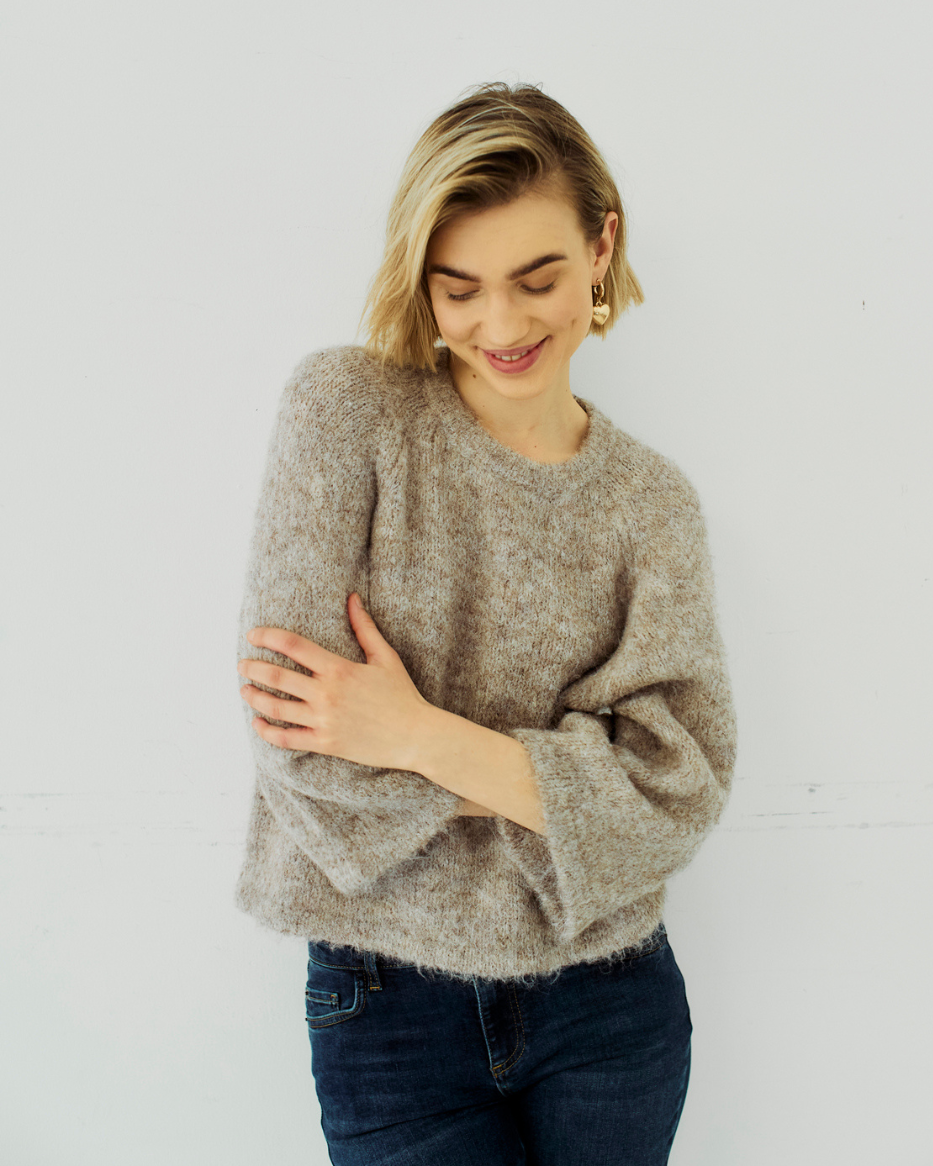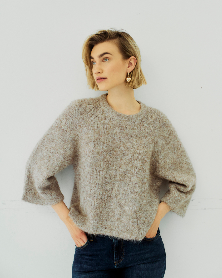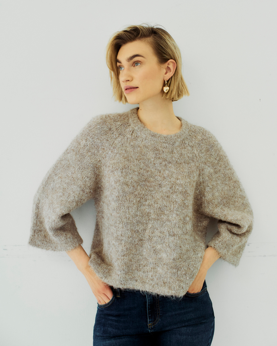 Grslulu er en myk og lett strikkegenser med et tidløst og feminint uttrykk. Garnet har en melert fargeeffekt som gir genseren et levende og eksklusivt utseende.