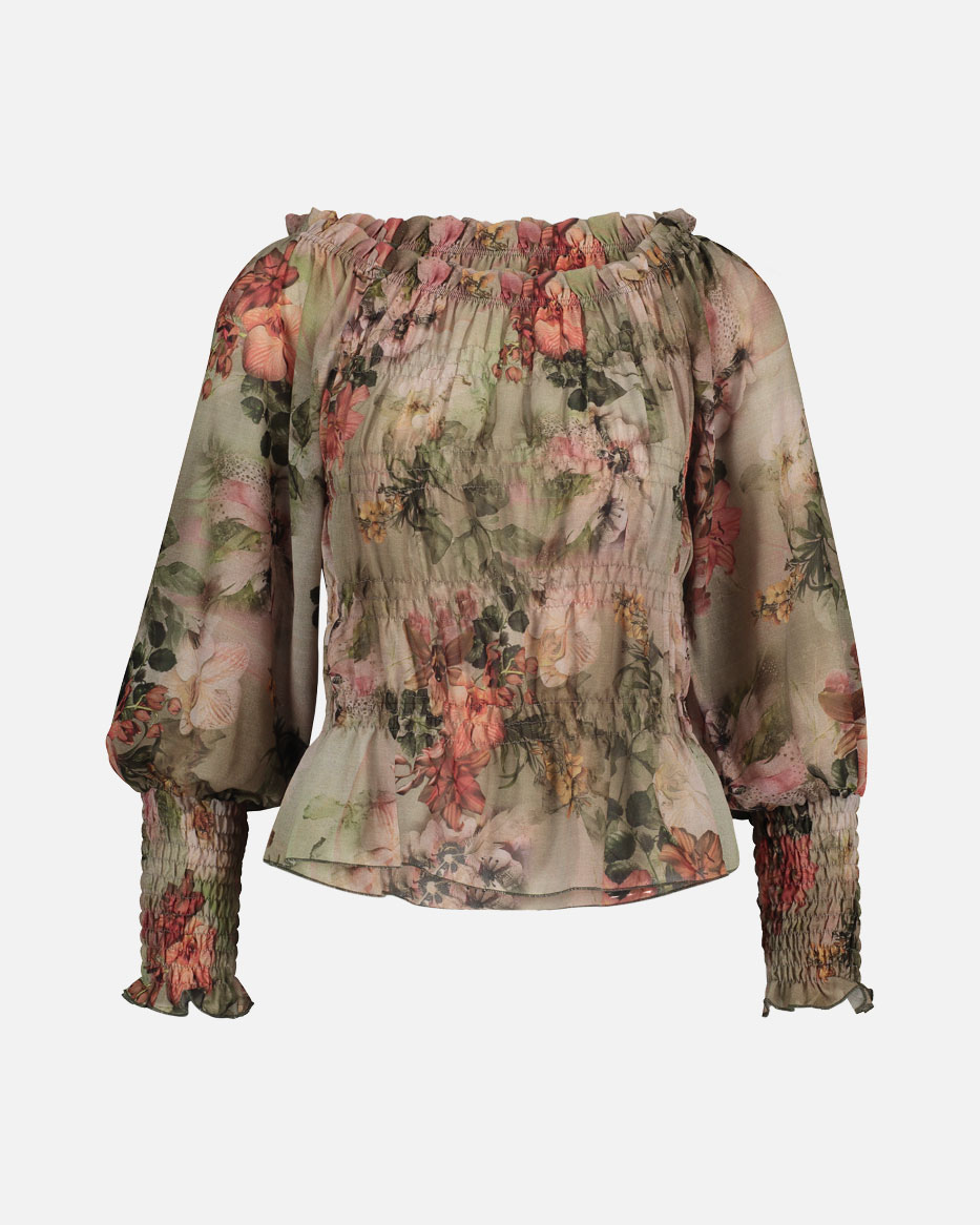 Lydiana-blusen er laget i lett og luftig chiffon med et delikat småblomstret mønster. Stoffet er lett gjennomsiktig og gir et sofistikert og romantisk uttrykk. Blusen har lange ballongermer med bred elastisk smock på mansjetten, som former seg flatterende etter kroppen og skaper en feminin silhuett. Den lille peplum-detaljen fremhever midjen på en elegant måte.