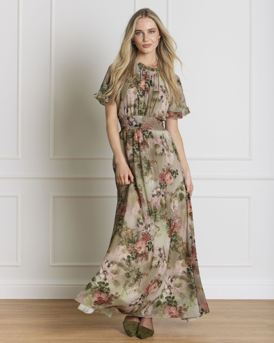 Liane-kjolen er en lang og delikat chiffonkjole med et vakkert blomsterprint som gir et feminint og sofistikert uttrykk. Den har rund hals med liten volangkant og knapp i nakken, samt små legg på overdelen som skaper en lett drapert og flatterende silhuett.