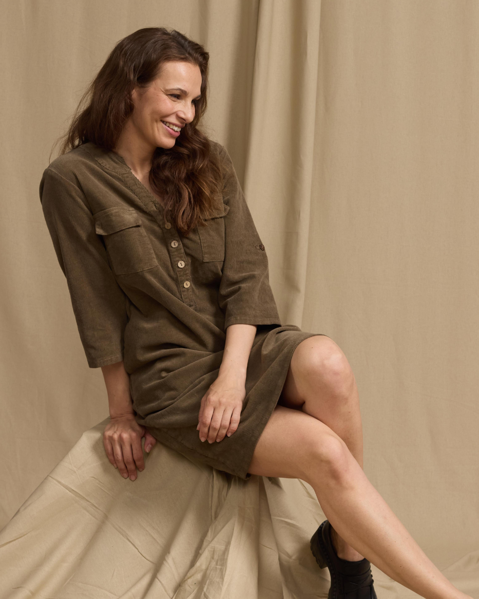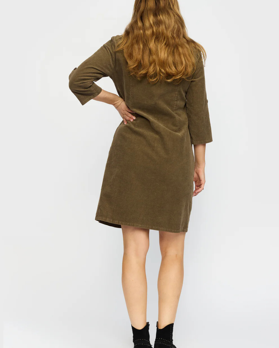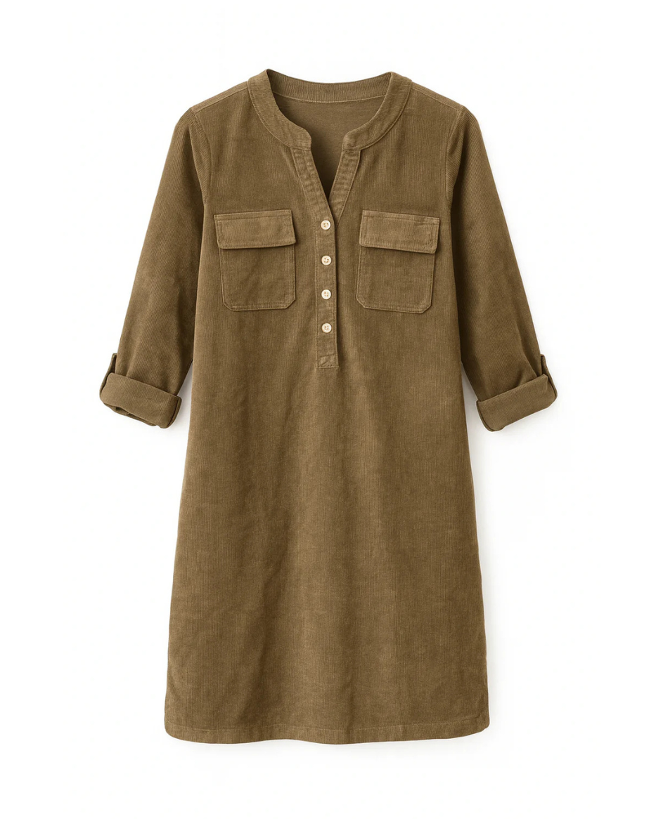 Oppdag Roberta, en elegant kort kjole i myk fløyel som kombinerer komfort med moderne stil. Kjolen har stolpeknepping i front, brystlommer og lommer i sidene – funksjonelle detaljer som gir et gjennomført og trendy uttrykk.