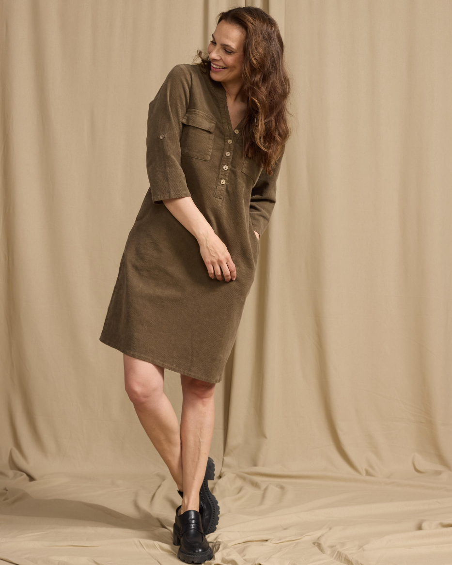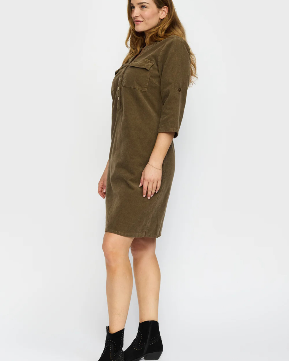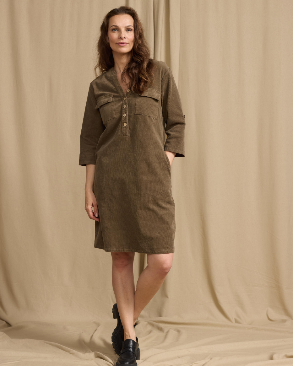 Oppdag Roberta, en elegant kort kjole i myk fløyel som kombinerer komfort med moderne stil. Kjolen har stolpeknepping i front, brystlommer og lommer i sidene – funksjonelle detaljer som gir et gjennomført og trendy uttrykk.