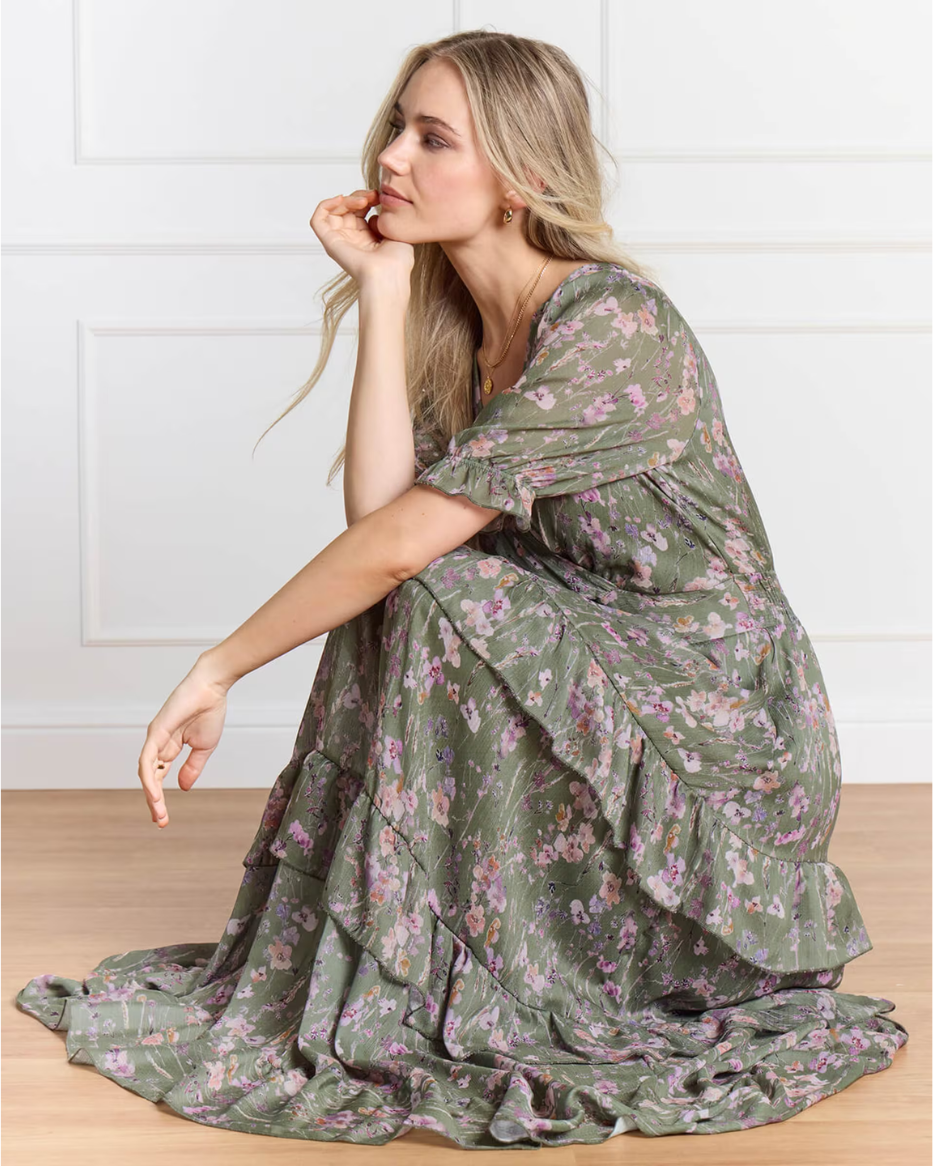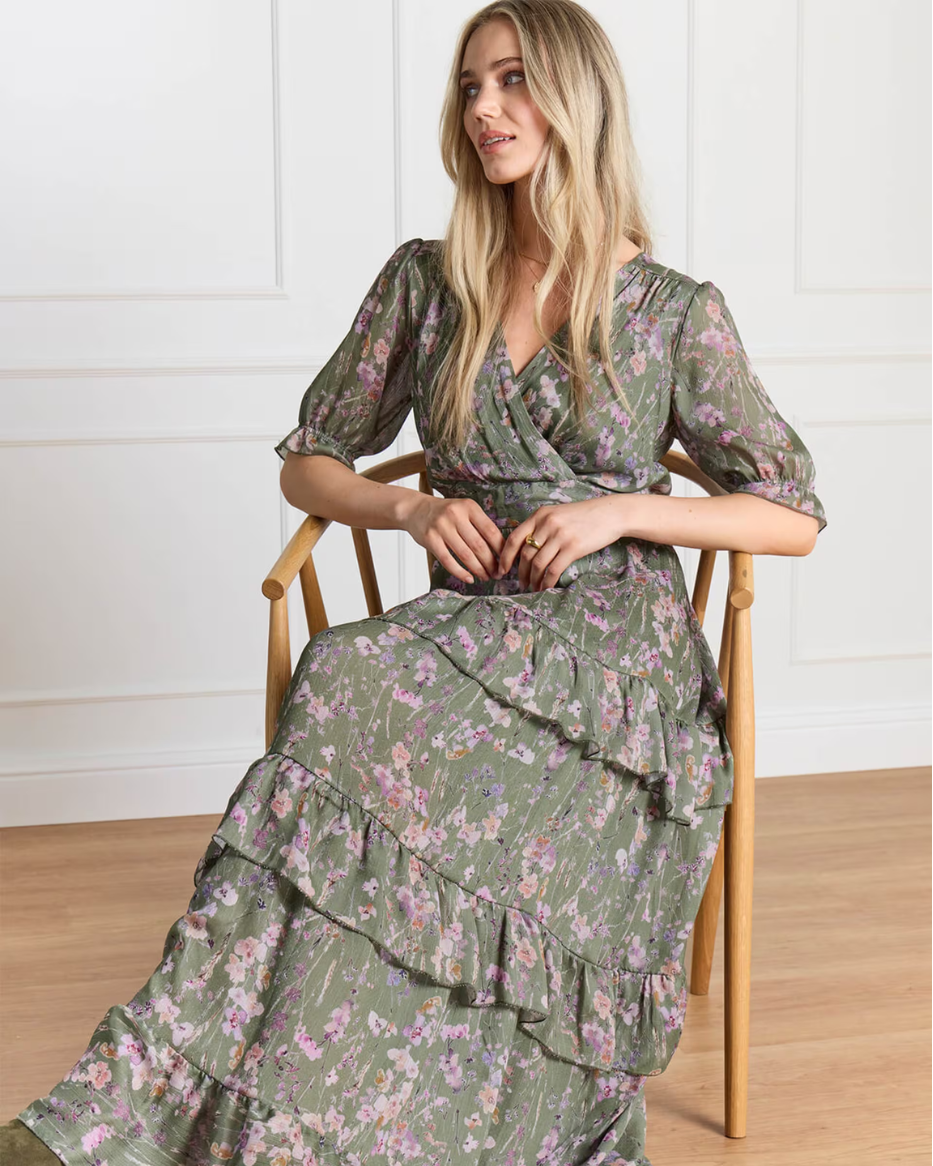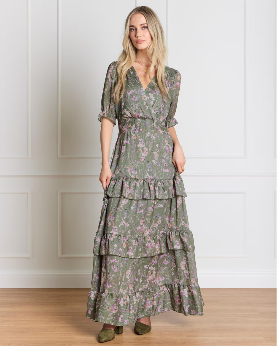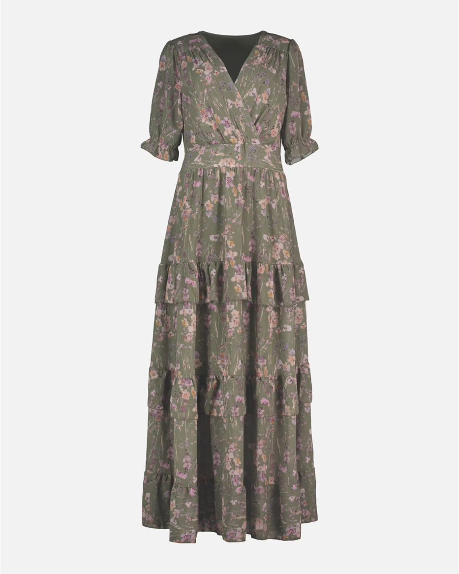 Amora-kjolen er en lang, feminin kjole i delikat chiffon med svart bunnfarge og nydelig blomsterprint. Den har en ledige overdel med omslag og flatterende V-hals, som gir et elegant uttrykk.