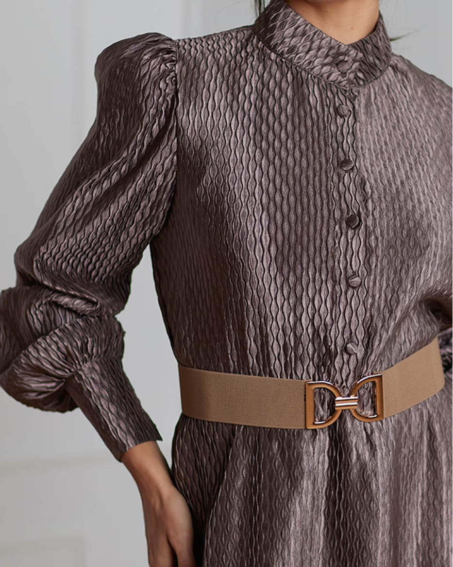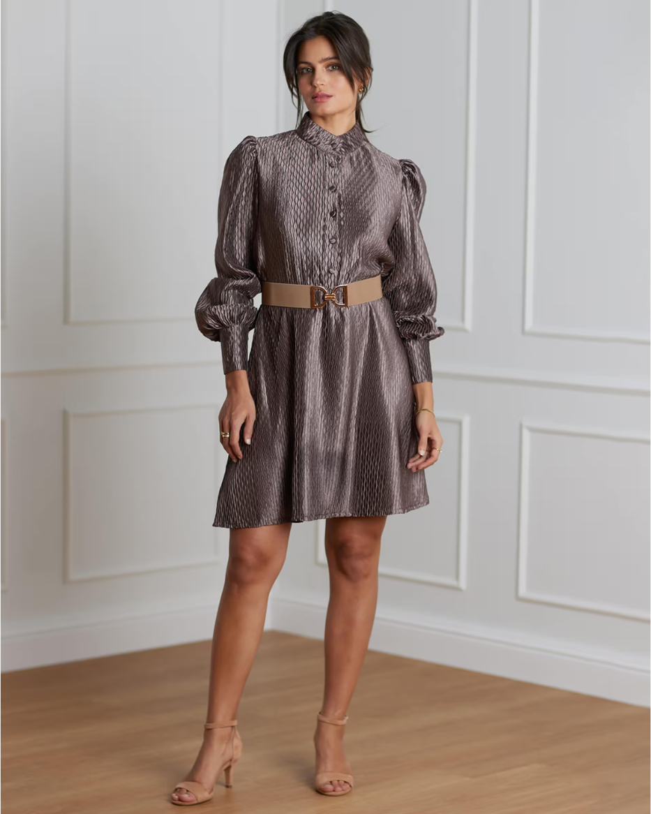 Kjolen har en høy krage som kan styles både lukket for et sofistikert uttrykk, eller med noen knapper åpne for en mer avslappet stil. De tekstiltrukne knappene nedover overdelen i matchende stoff tilfører et elegant preg.