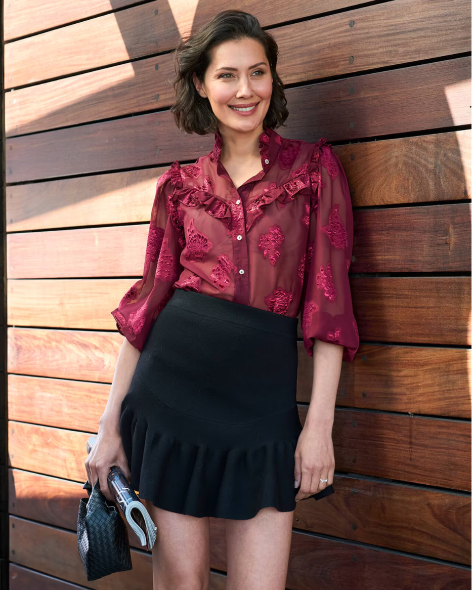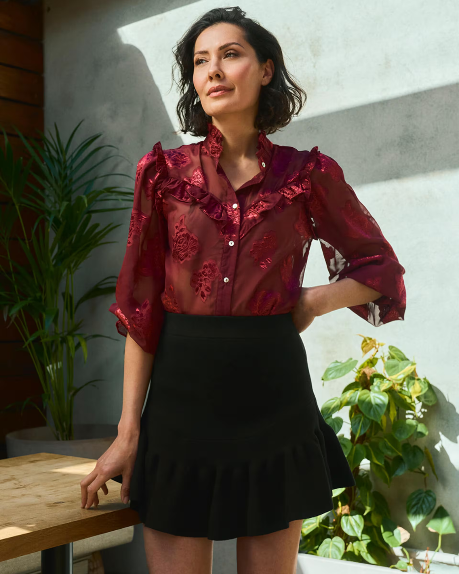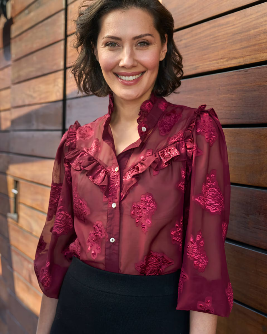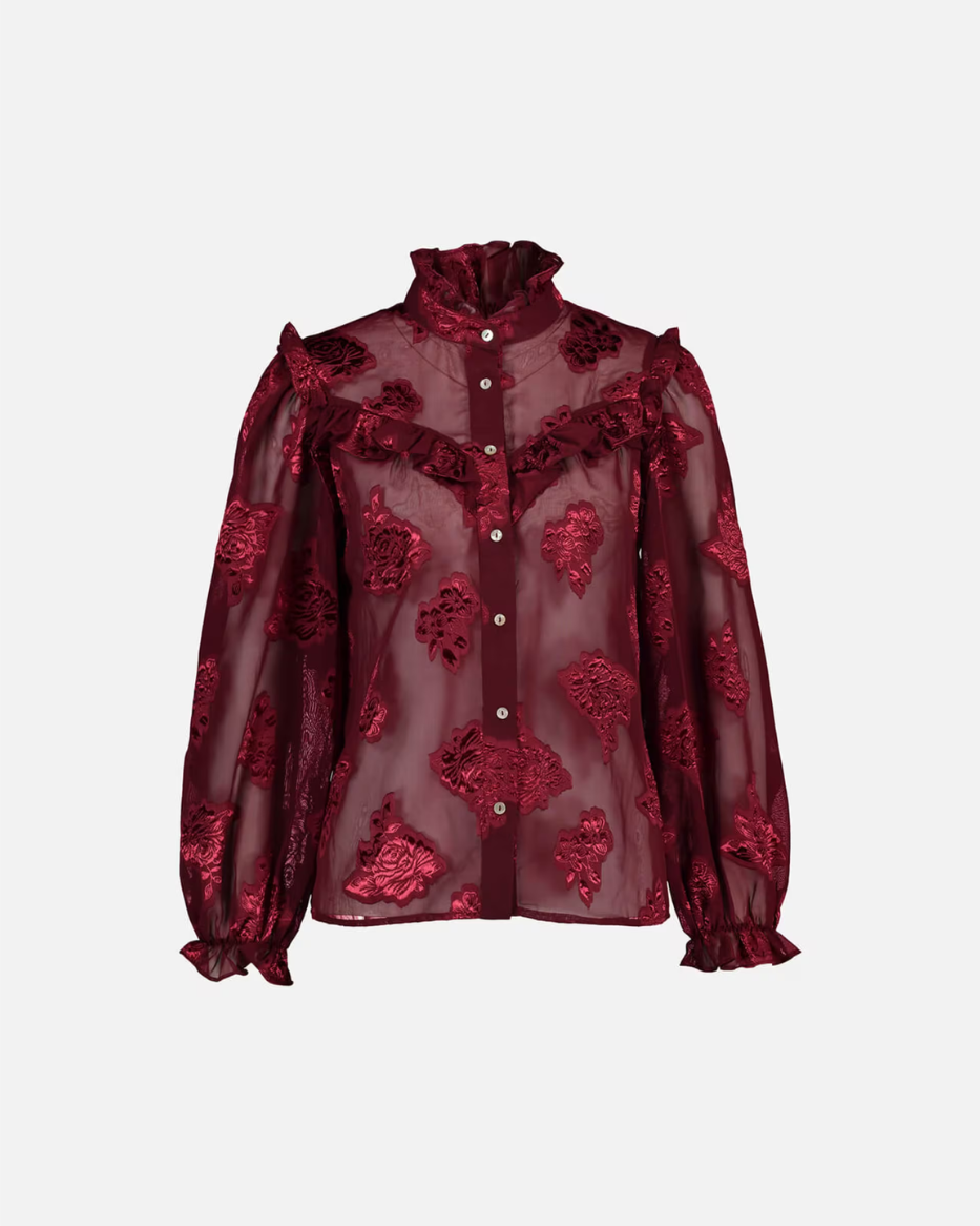 Emaja-blusen kombinerer eleganse og letthet på en sofistikert måte. Det delikate, gjennomsiktige stoffet gir antrekket et feminint uttrykk som passer perfekt både til hverdag og fest. De vakre ton-i-ton blomstene tilfører et eksklusivt preg, mens volangene langs brystpartiet og i halsen gir en romantisk og tidløs touch.