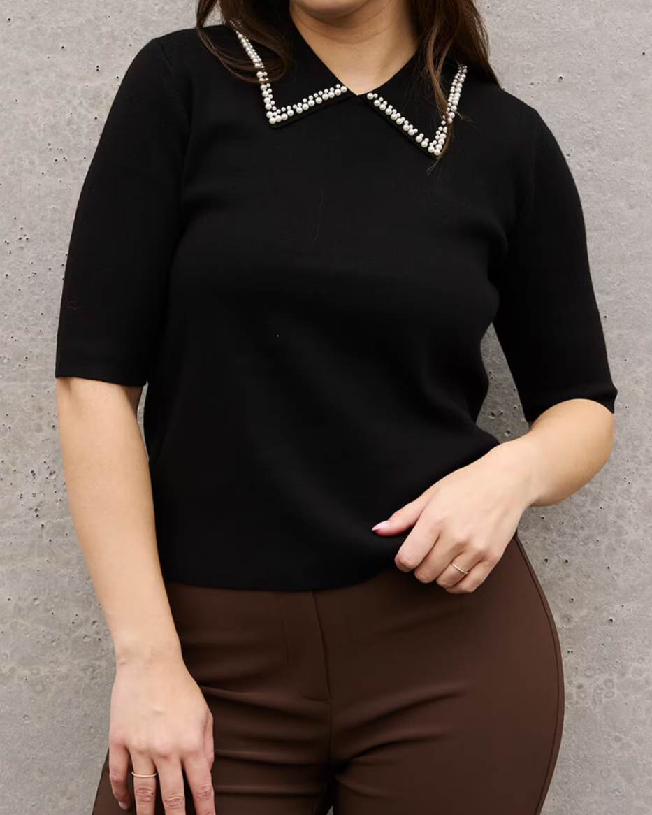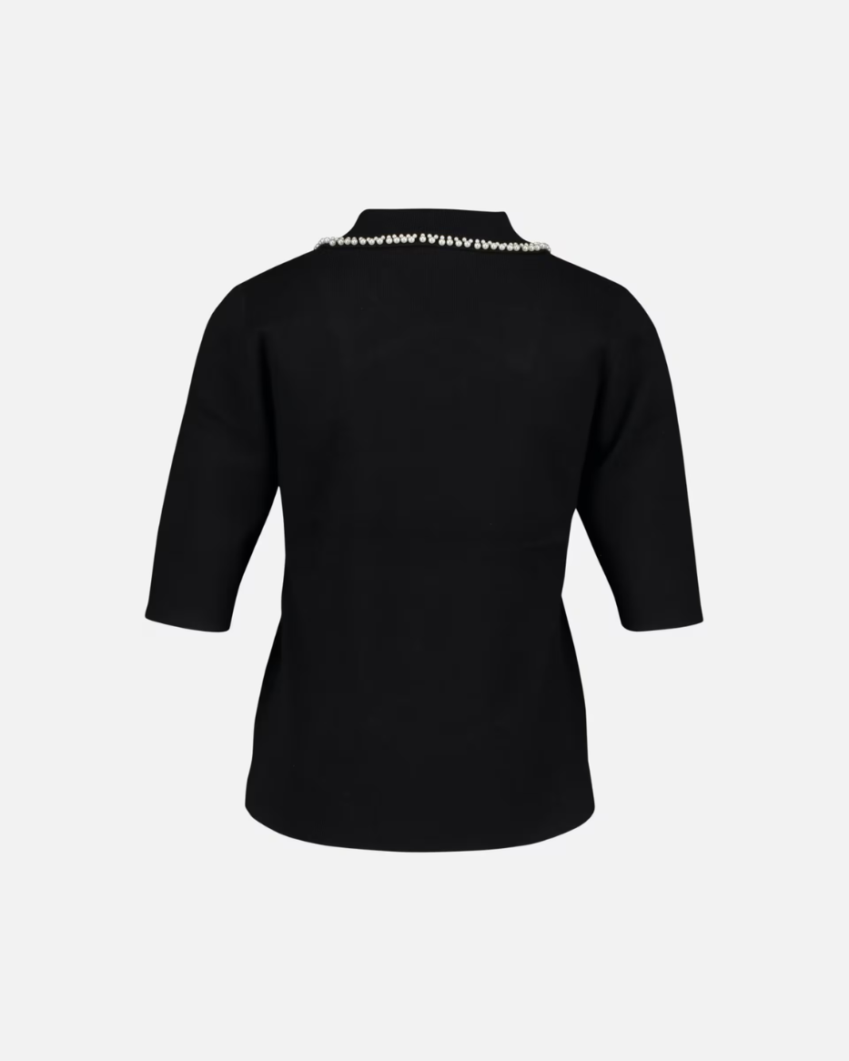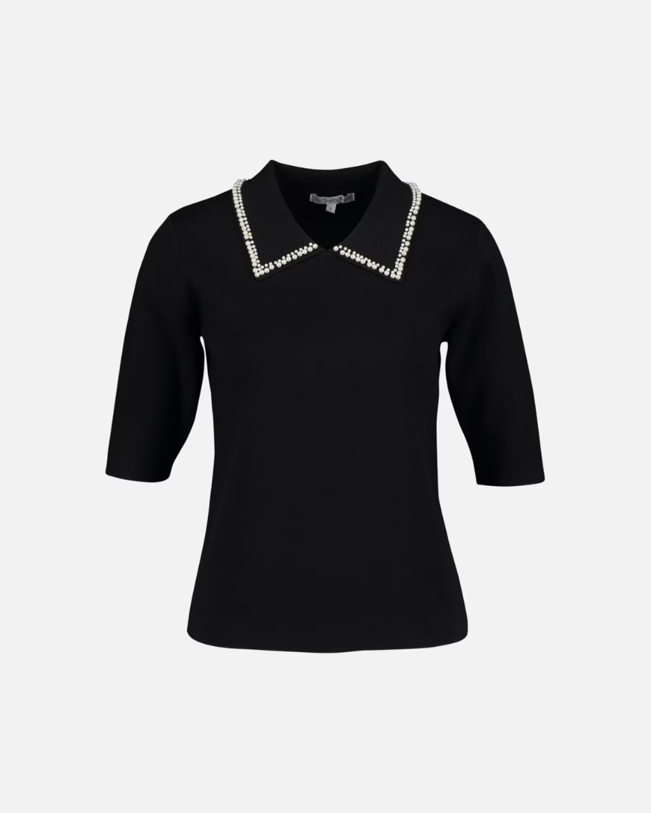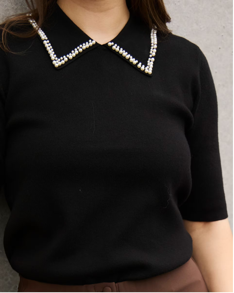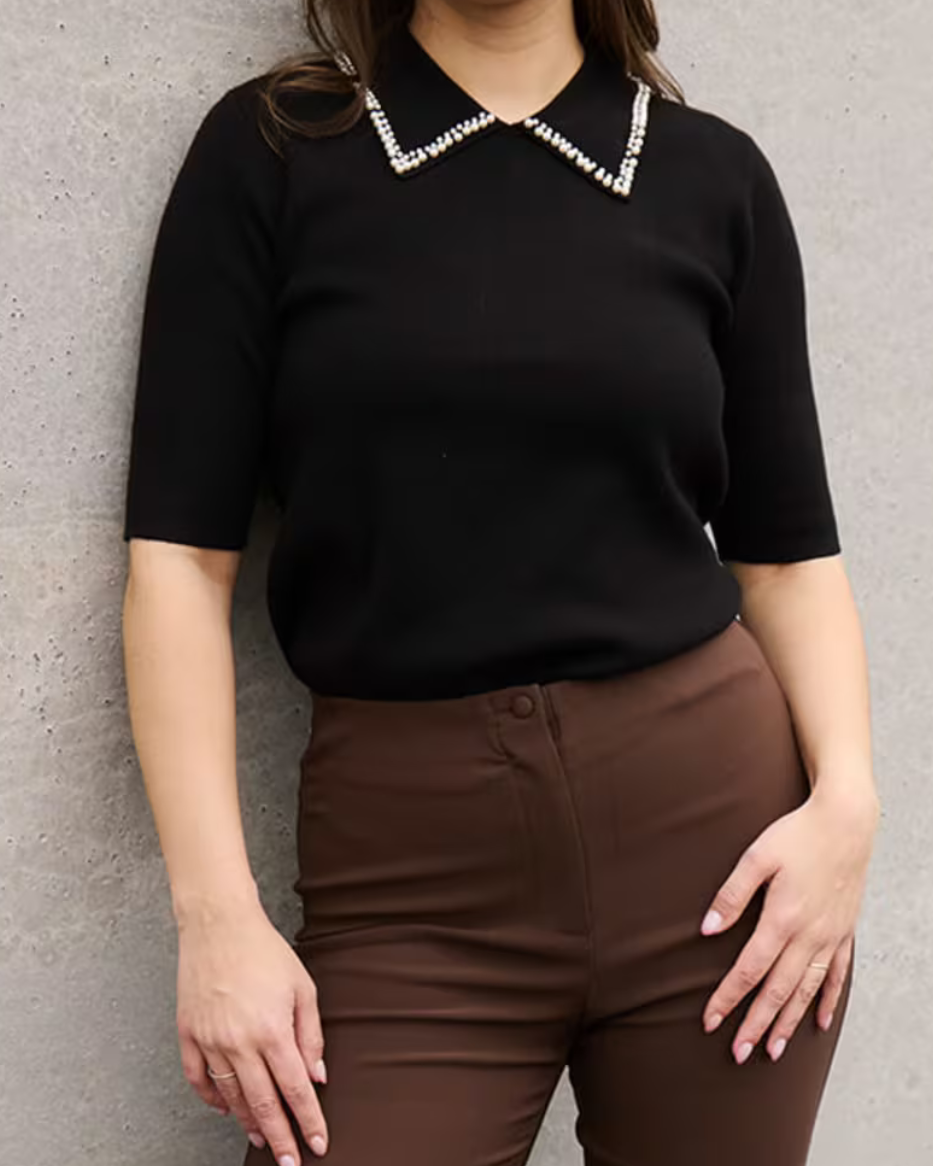 Valentina er en elegant og eksklusiv topp i myk ribbestrikket viskoseblanding med svært god stretch som gir høy komfort hele dagen. Toppen har en klassisk krage dekorert med vakre perler foran og bak, som tilfører et sofistikert og feminint uttrykk.