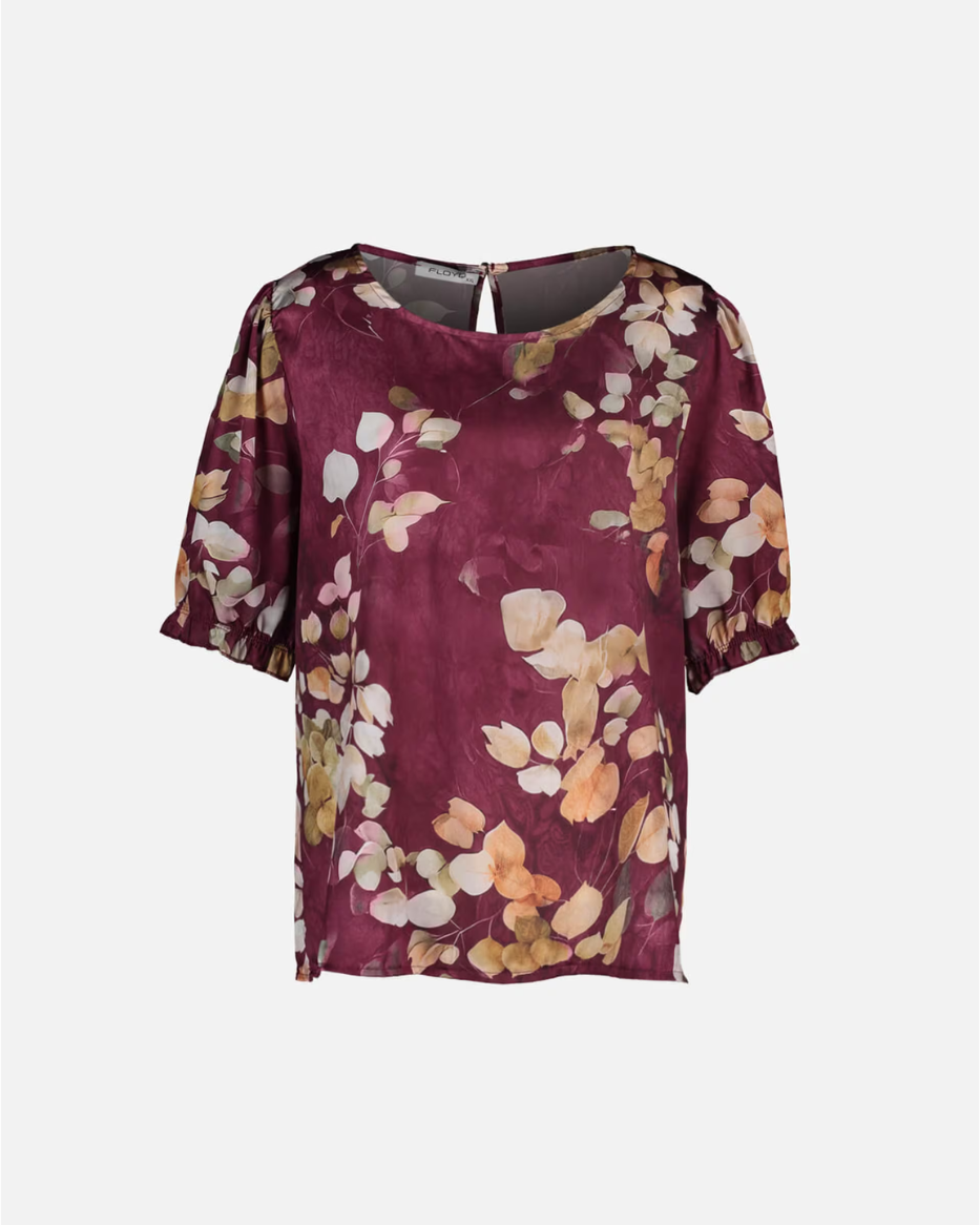 Sirin Lun er en myk og glansfull satengtopp med et delikat blomsterprint i duse toner av fersken, hvitt og krem – en nydelig palett som enkelt kan styles med accessories i matchende farger.