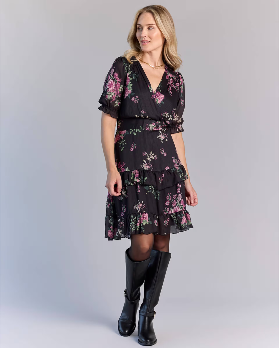 Amora-kjolen er en kort, feminin kjole i delikat chiffon med svart bunnfarge og nydelig blomsterprint. Den har en ledige overdel med omslag og flatterende V-hals, som gir et elegant uttrykk.