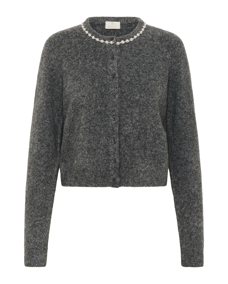Roxy-cardigan er en elegant og feminin jakke med klassisk rund hals og lange ermer, pyntet med perler rundt kanten ved halsen for et sofistikert uttrykk. Den rette fasongen gjør den lett å kombinere og gir et rent, stilfullt uttrykk.