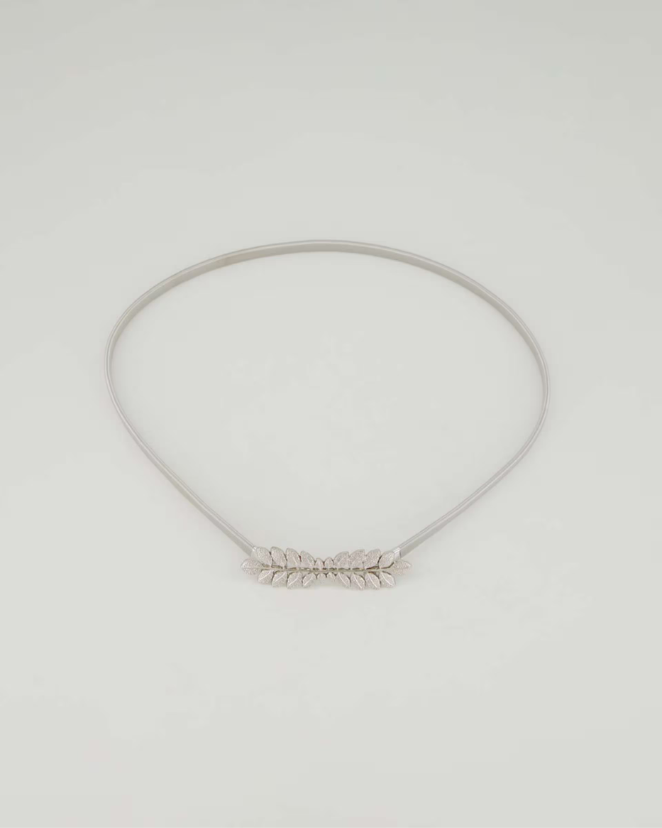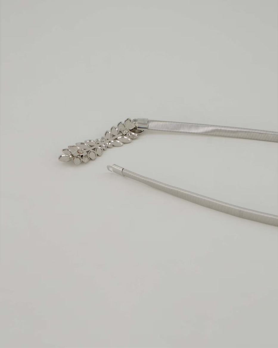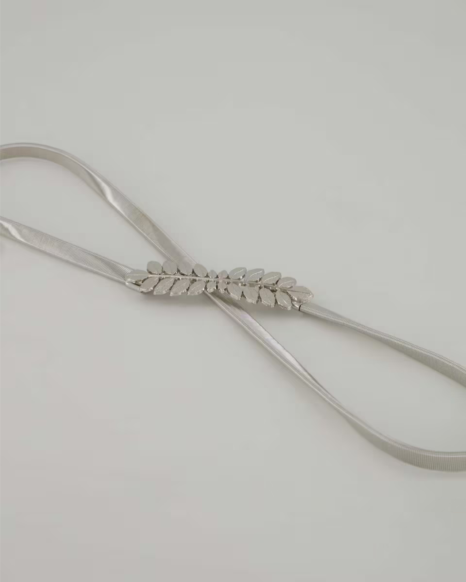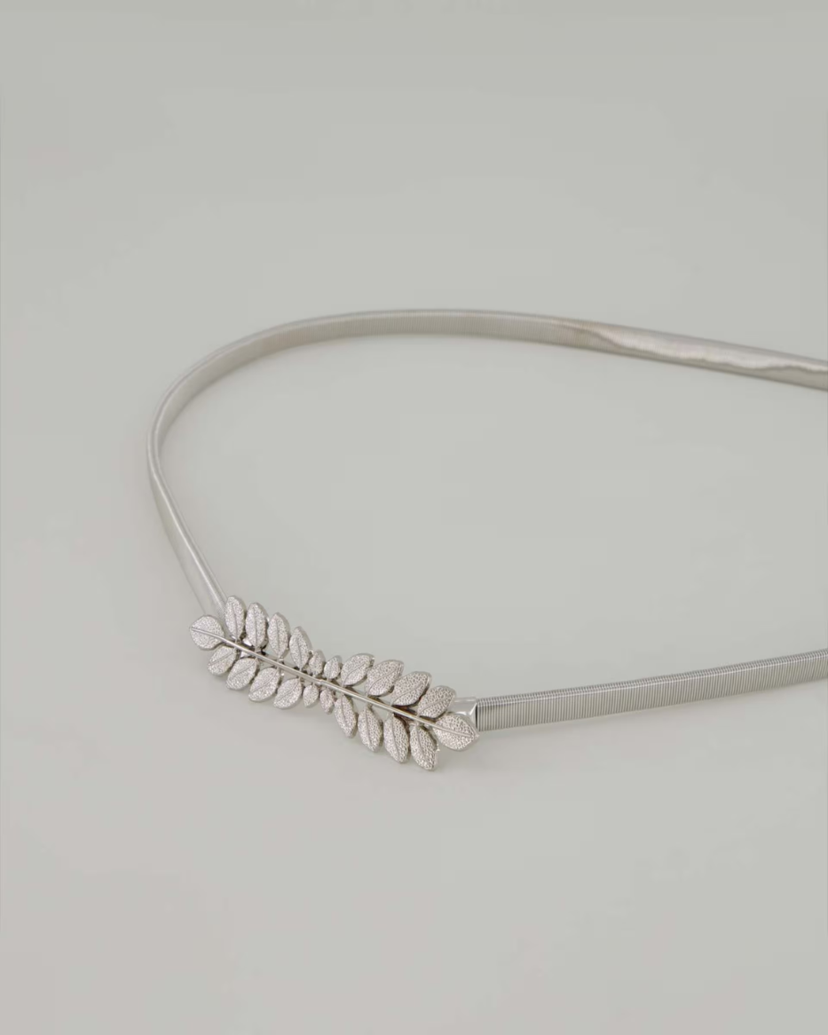 Gi antrekket ditt et sofistikert og feminint preg med Glory, et elastisk belte i sølvfarge med nydelig bladformet dekor foran. Dette beltet kombinerer moderne eleganse med et romantisk, naturinspirert design som fremhever midjen på kjoler, bluser eller tunikaer. Den elastiske konstruksjonen gir optimal komfort og en perfekt passform, mens den enkle hempe-lukkingen gjør det lett å ta av og på. Den detaljerte spennen med bladmotiv tilfører antrekket et unikt og iøynefallende uttrykk, og gjør Glory til et ideelt tilbehør som løfter både hverdags- og festantrekk med minimal innsats.