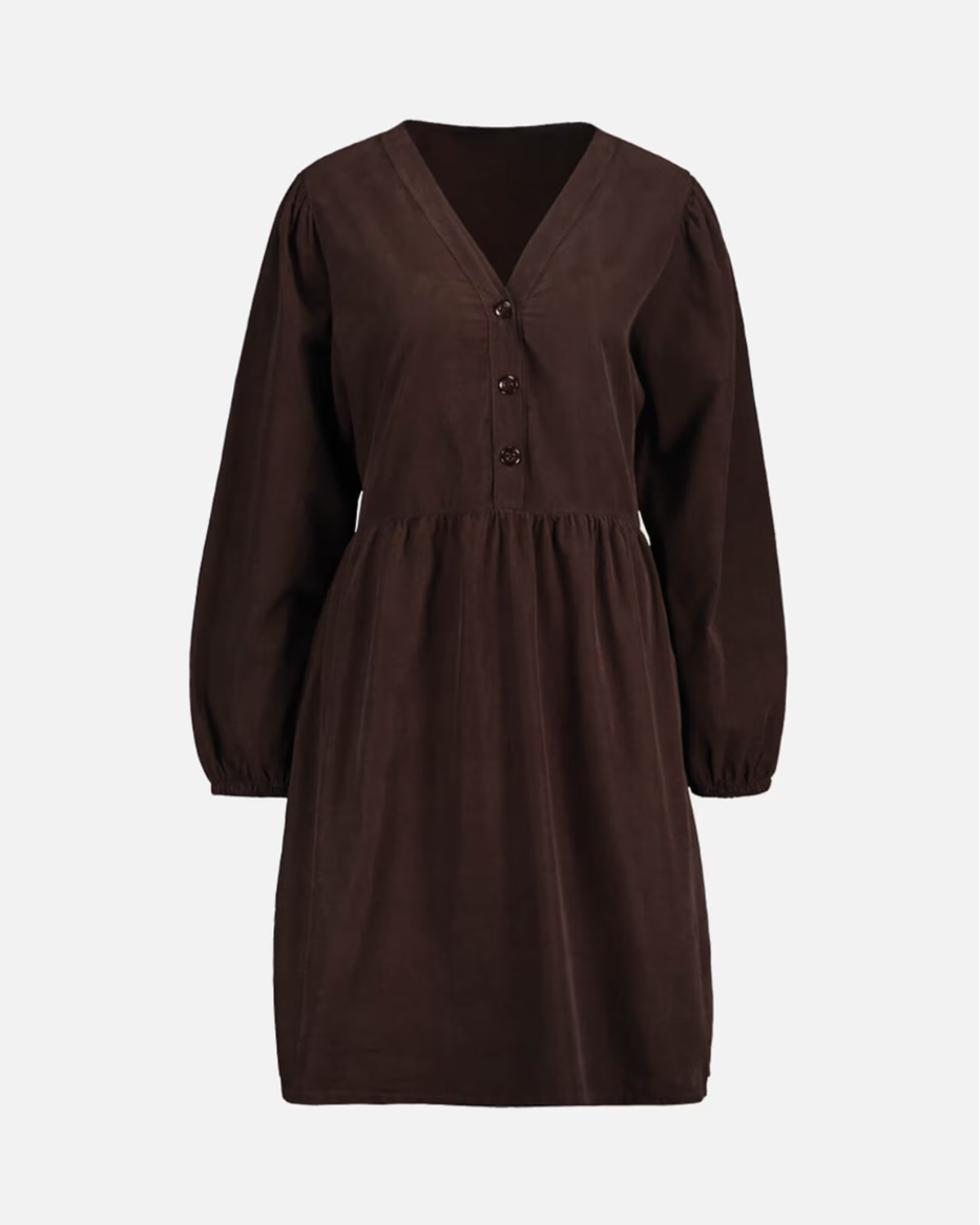 Ronda Babycord kjole er en myk kordfløyelkjole som kombinerer komfort med et moderne uttrykk. Den har en V-hals med knapper nedover overdelen, og lange ballongermer med tynn strikk rundt håndleddene som gir et feminint preg.