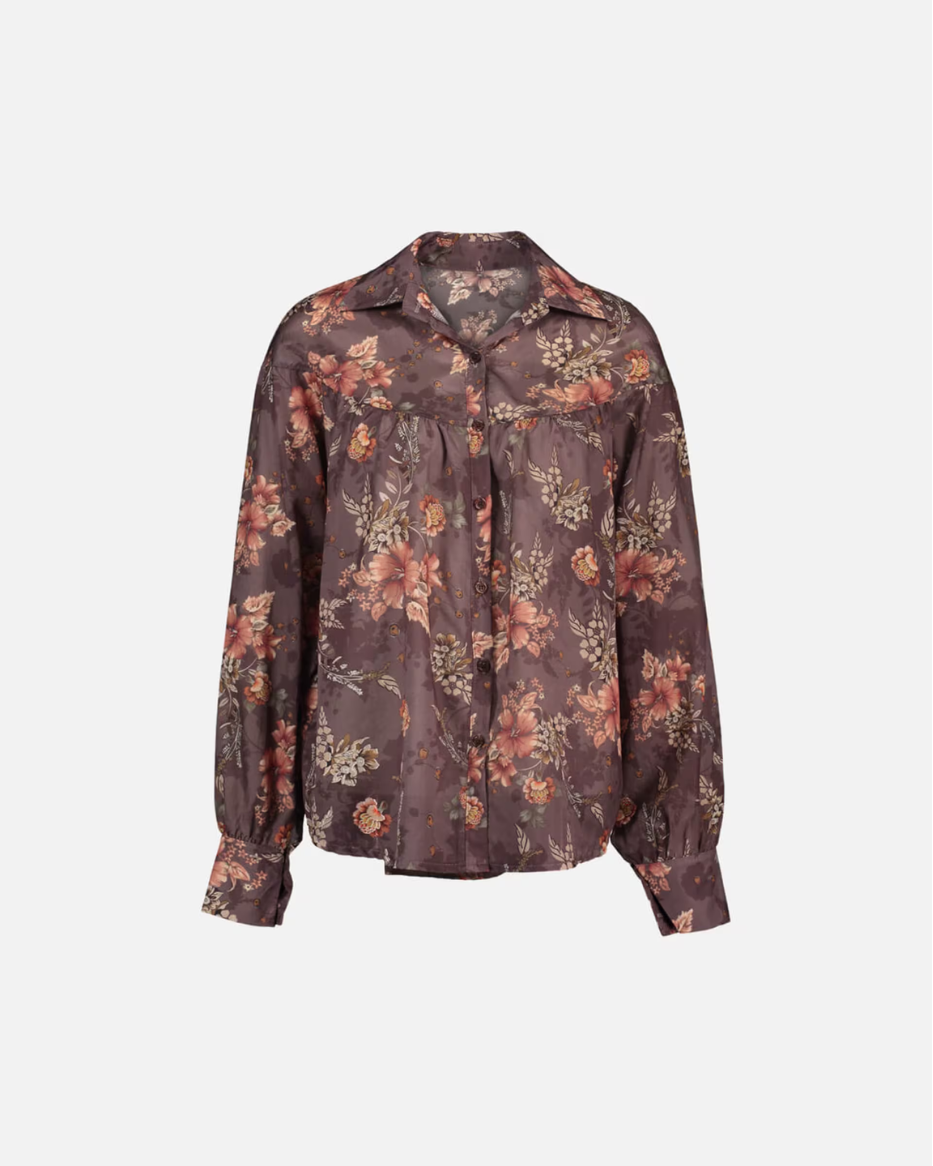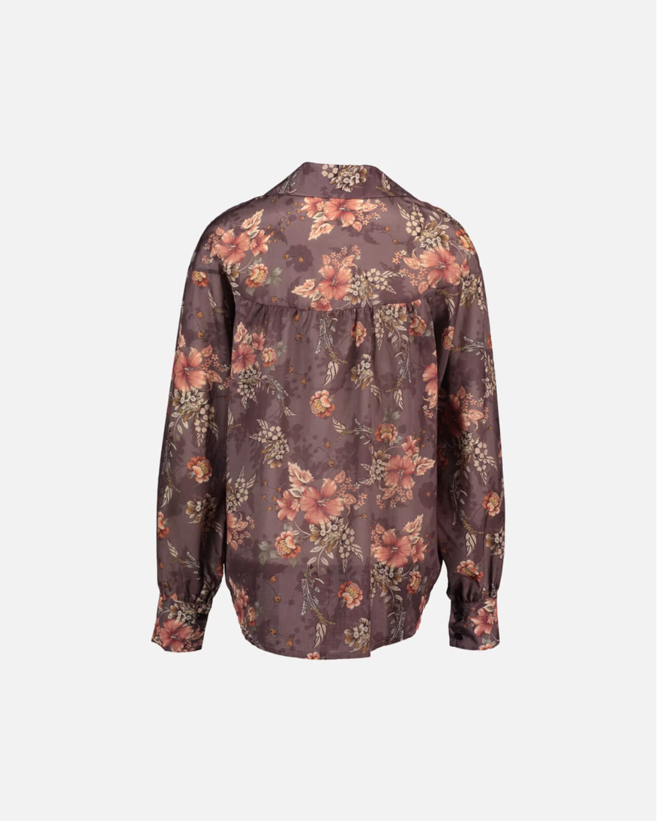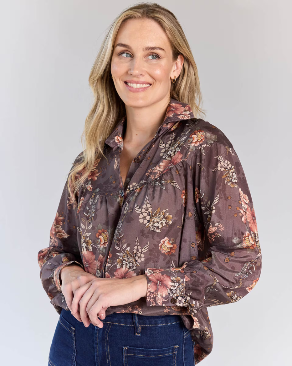 Aina-blusen er en lett skjorte med nydelig blomstermønster i varme, jordnære toner som gir et tidløst og feminint uttrykk. Den er laget i en behagelig blanding av bomull og viskose, som gir et mykt og luftig fall.