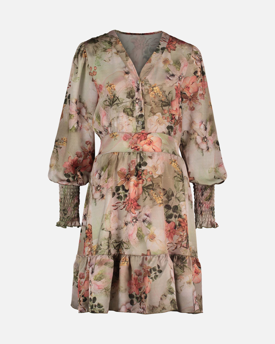 Kjolen har V-hals med knepping i stolpe, markert midje og strikk i ryggen for optimal passform og komfort. Skjørtet faller vakkert med en kappe nederst som skaper en lett og sofistikert silhuett.