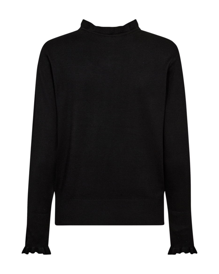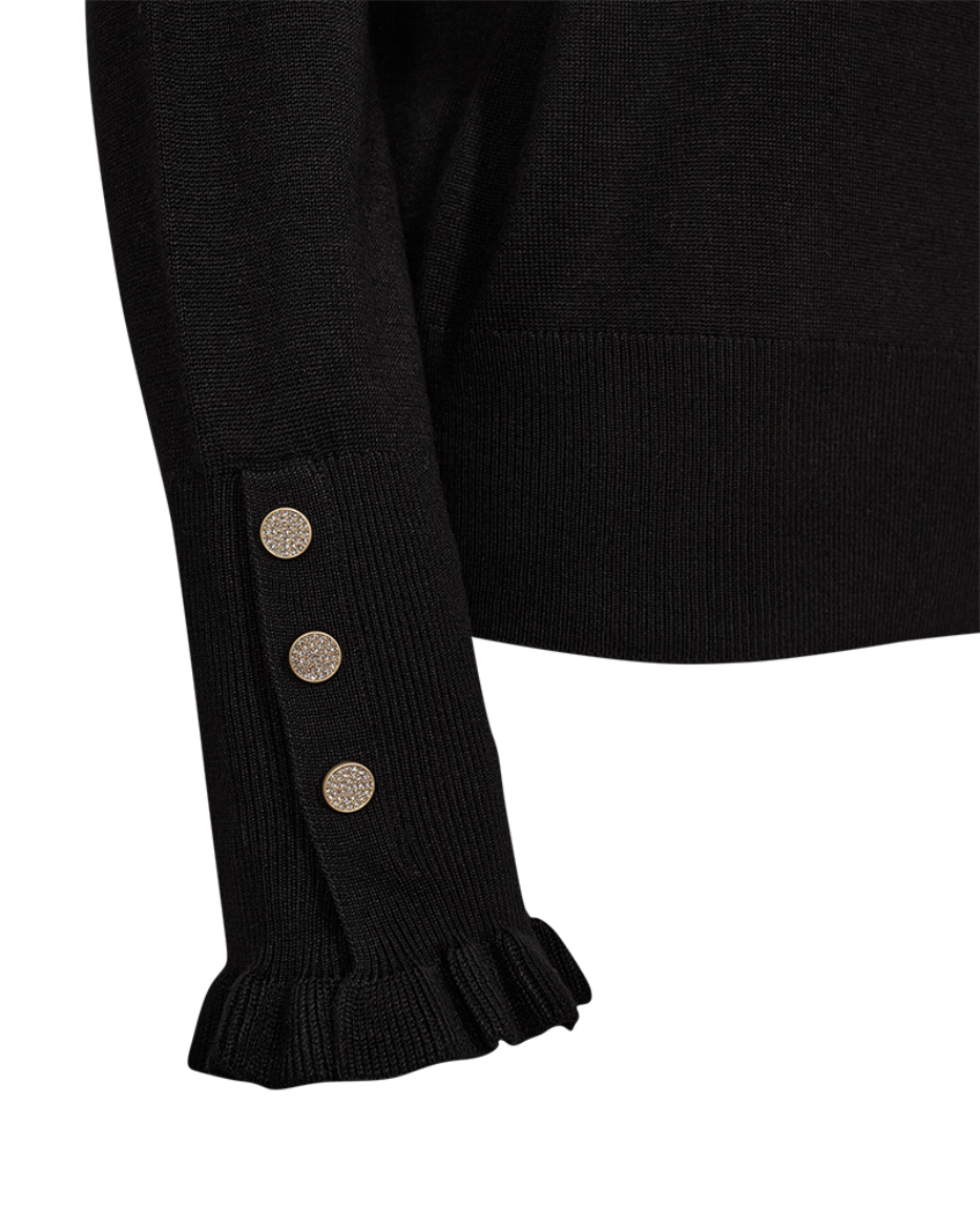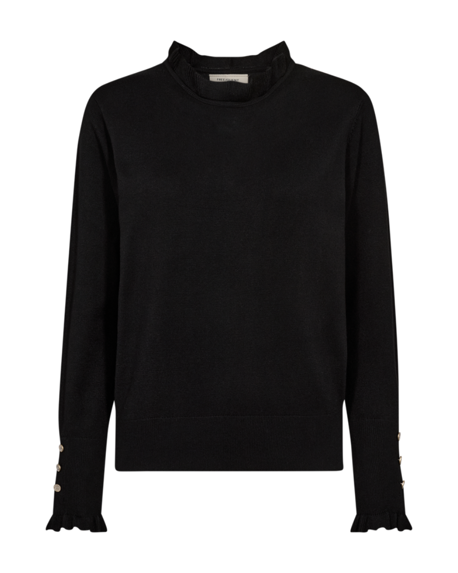 Katie strikkegenser er en myk og feminin genser med fine detaljer. Den har en elegant rysjekant i hals og ermer, samt dekorative knapper på mansjettene. Perfekt til både hverdags og jobb, men også lett å style opp til fest.