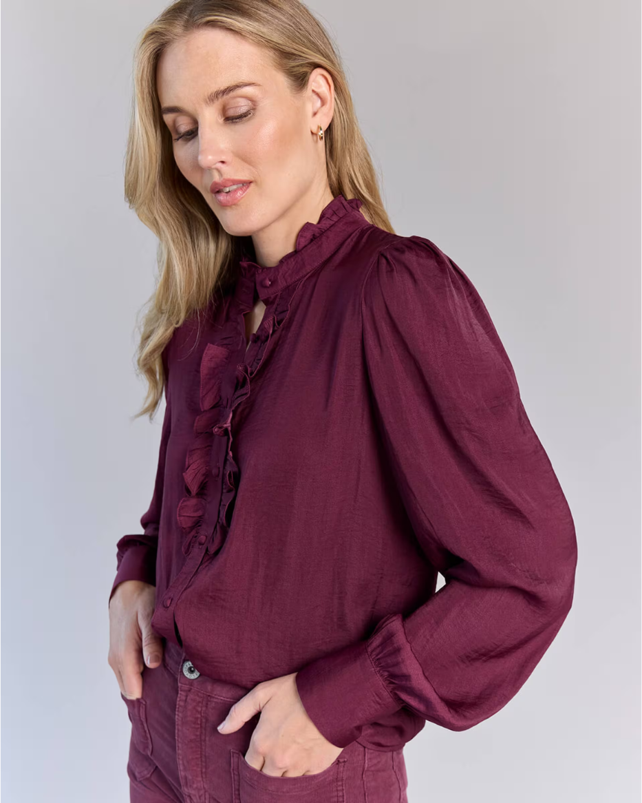 Leja-blusen er en elegant og feminin bluse laget i et mykt og behagelig materiale som føles luksuriøst mot huden. Den har en knappestolpe i front dekorert med delikate volanger og tekstiltrukne knapper, som gir et sofistikert og eksklusivt preg.