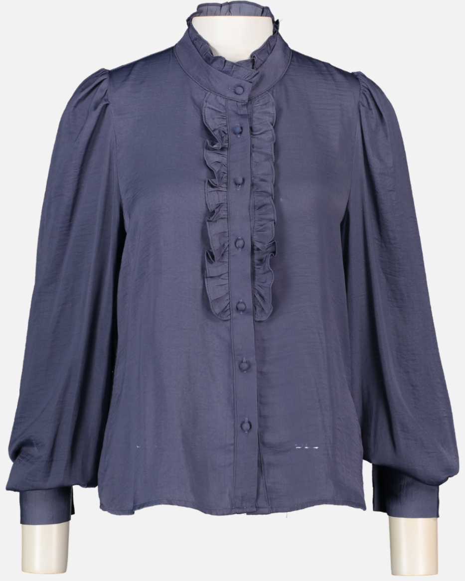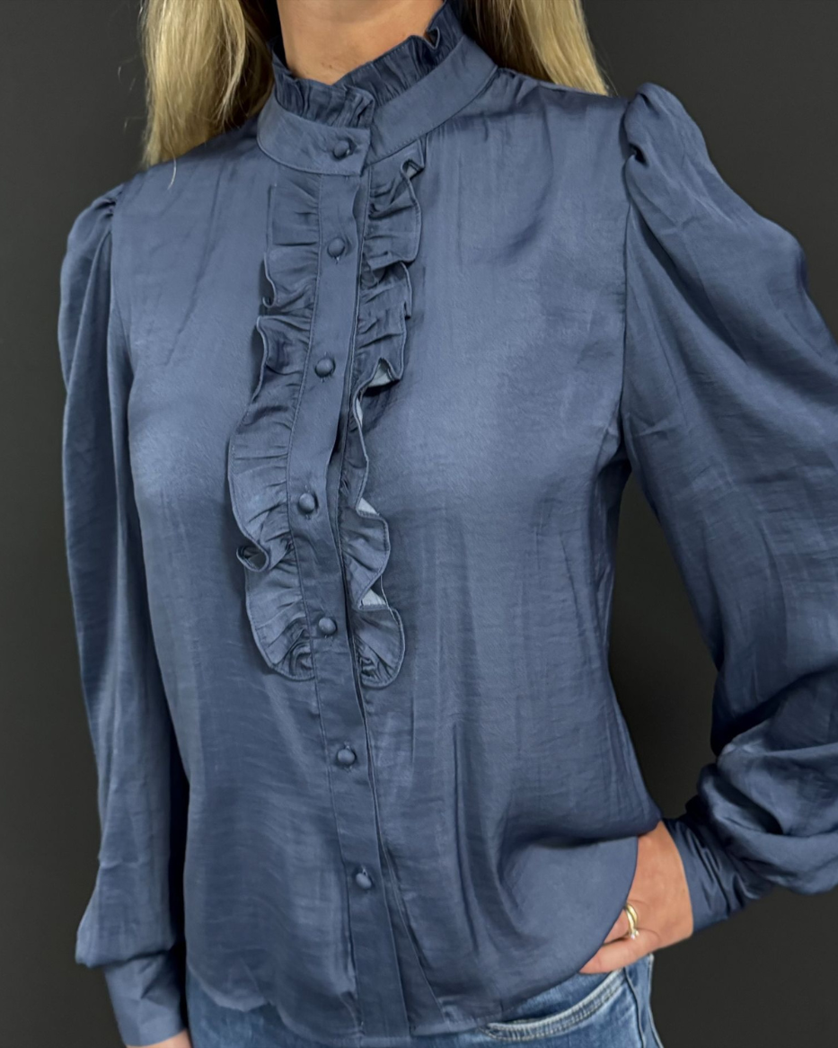 Leja-blusen er en elegant og feminin bluse laget i et mykt og behagelig materiale som føles luksuriøst mot huden. Den har en knappestolpe i front dekorert med delikate volanger og tekstiltrukne knapper, som gir et sofistikert og eksklusivt preg.