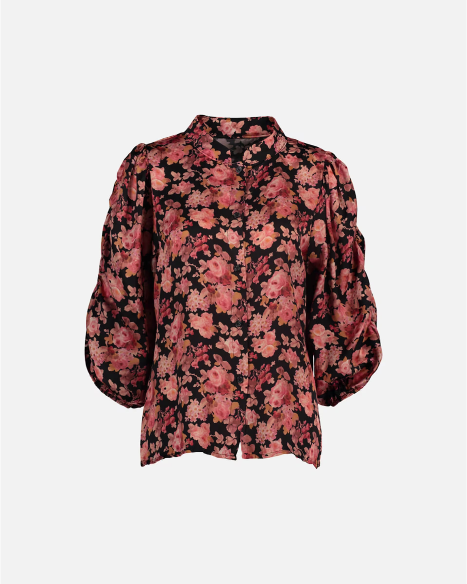 Donnie-blusen kombinerer klassisk snitt og moderne detaljer i en elegant design. Den har svart bunnfarge med blomsterprint i rosatoner, som gir et feminint og luksuriøst uttrykk.