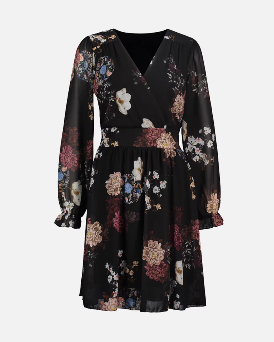 Lekker knelang kjole i delikat chiffon med blomsterprint som gir et lett og feminint uttrykk. Overdelen har en flatterende V-hals i omslag, og en markert midje som fremhever figuren. Strikk i ryggen sørger for en behagelig passform, mens de lange ermene med elastiske rysjemansjetter tilfører en romantisk touch.