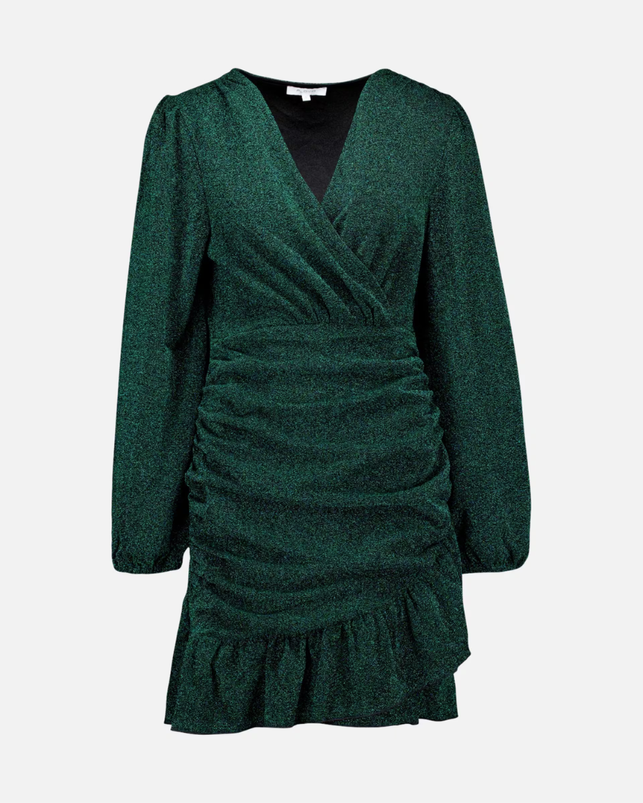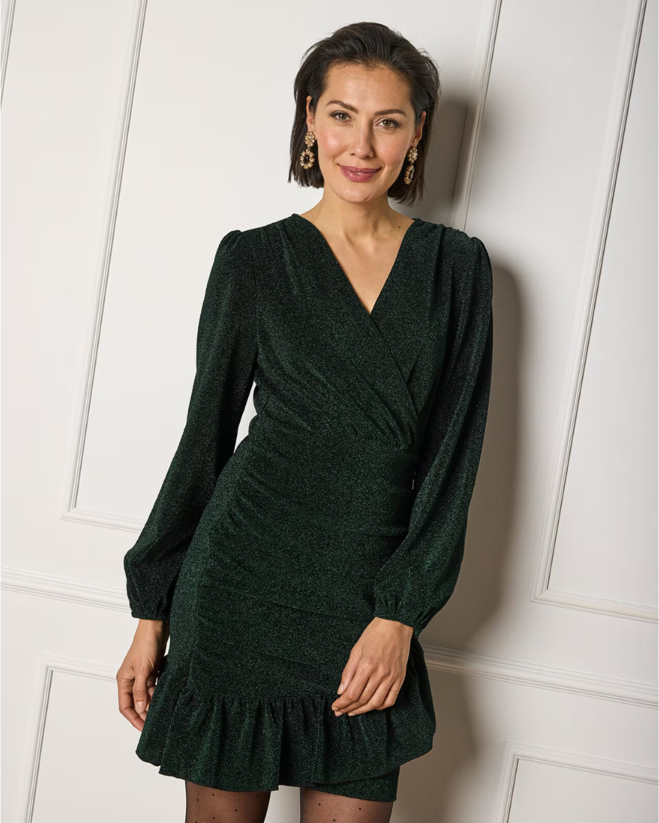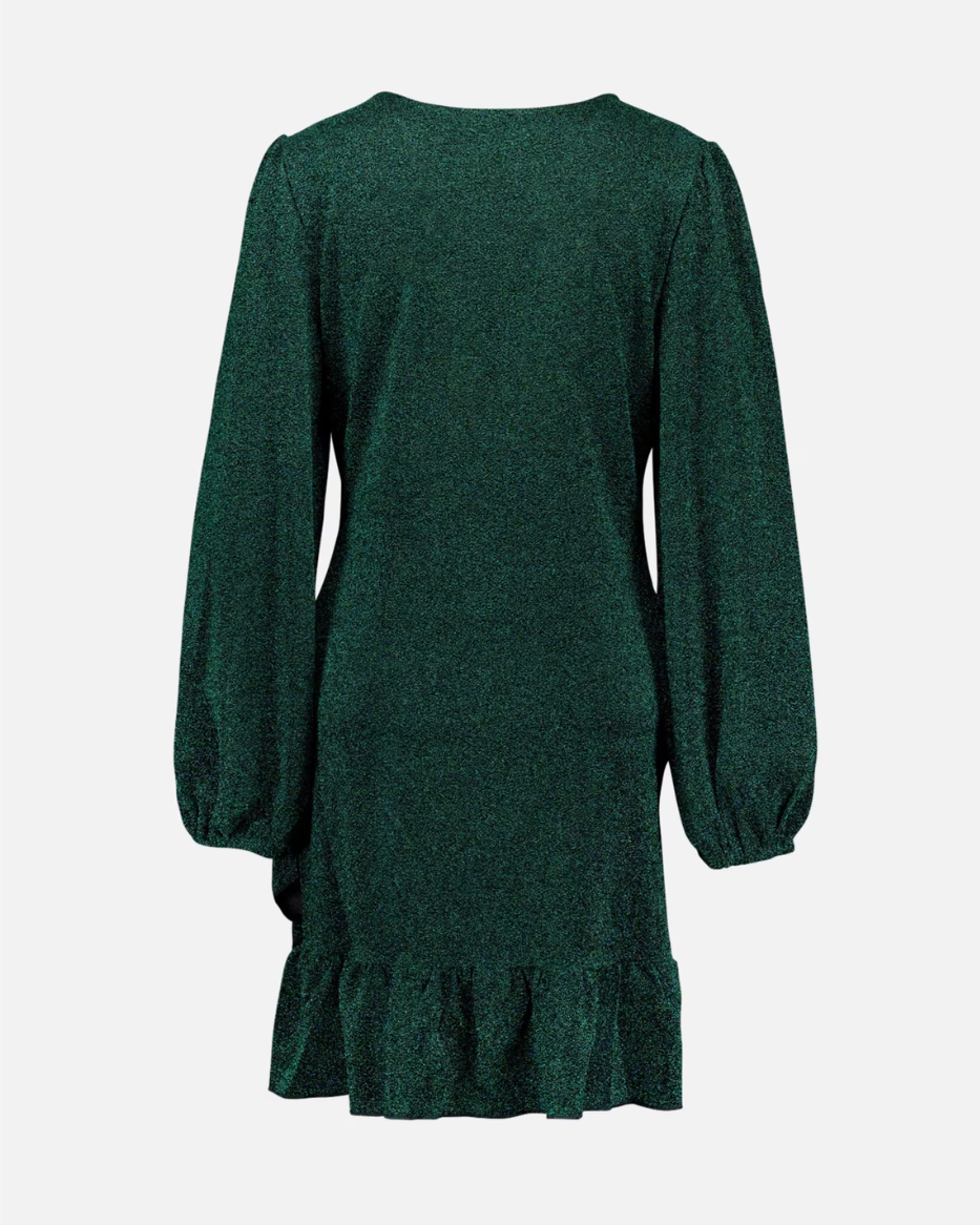 Kjolen har v-hals i omslag og lange, vide ermer med tynn strikk i enden. Snittlinjen i midjen har elastisk strikk foran som fremhever fasongen på en flatterende måte. Skjørtet har legg langs sidene som skaper delikate draperinger og en feminin silhuett, mens volangkanten nederst gir en elegant avslutning.