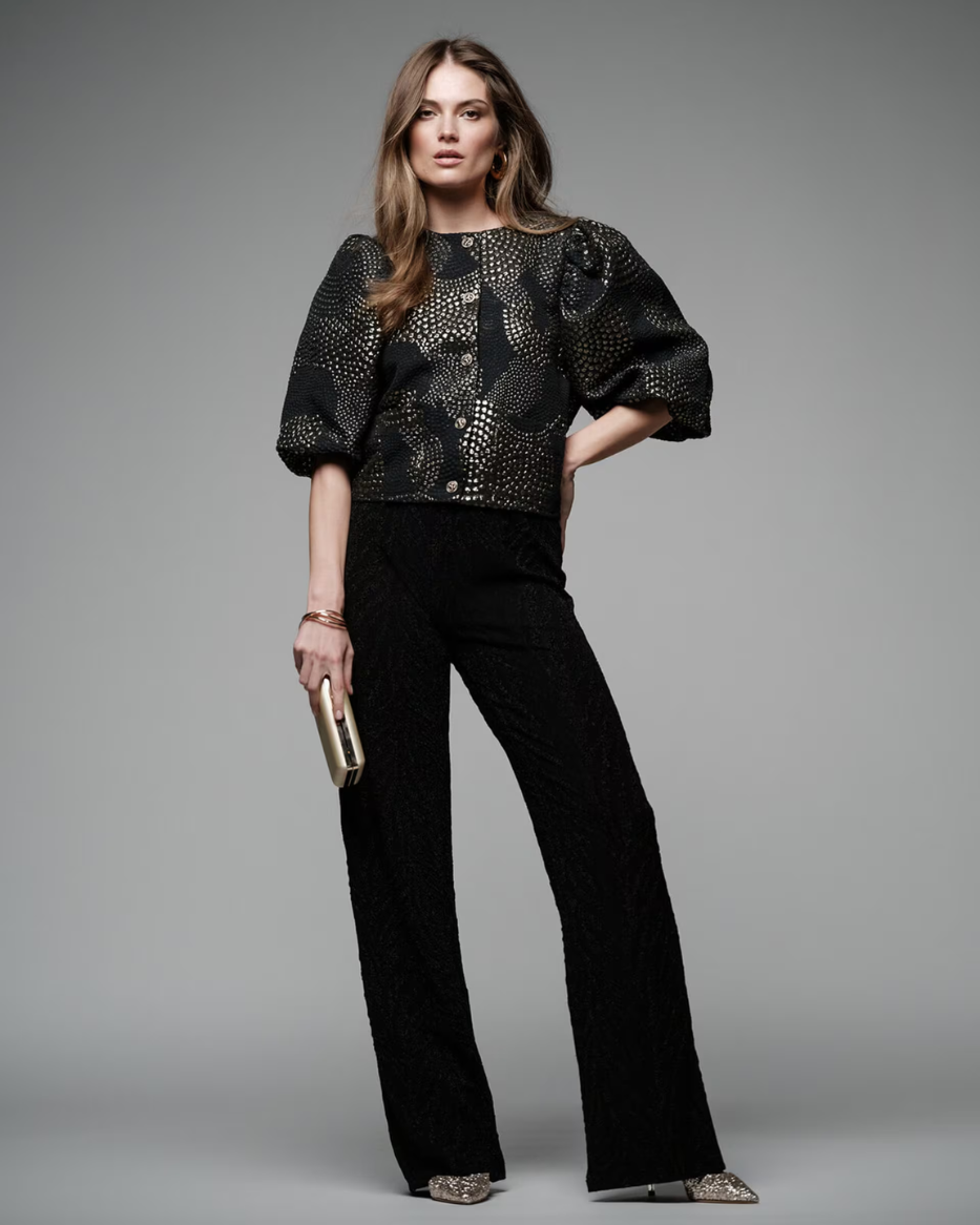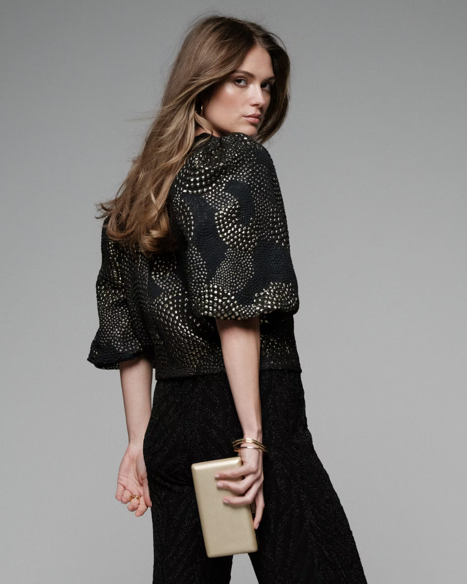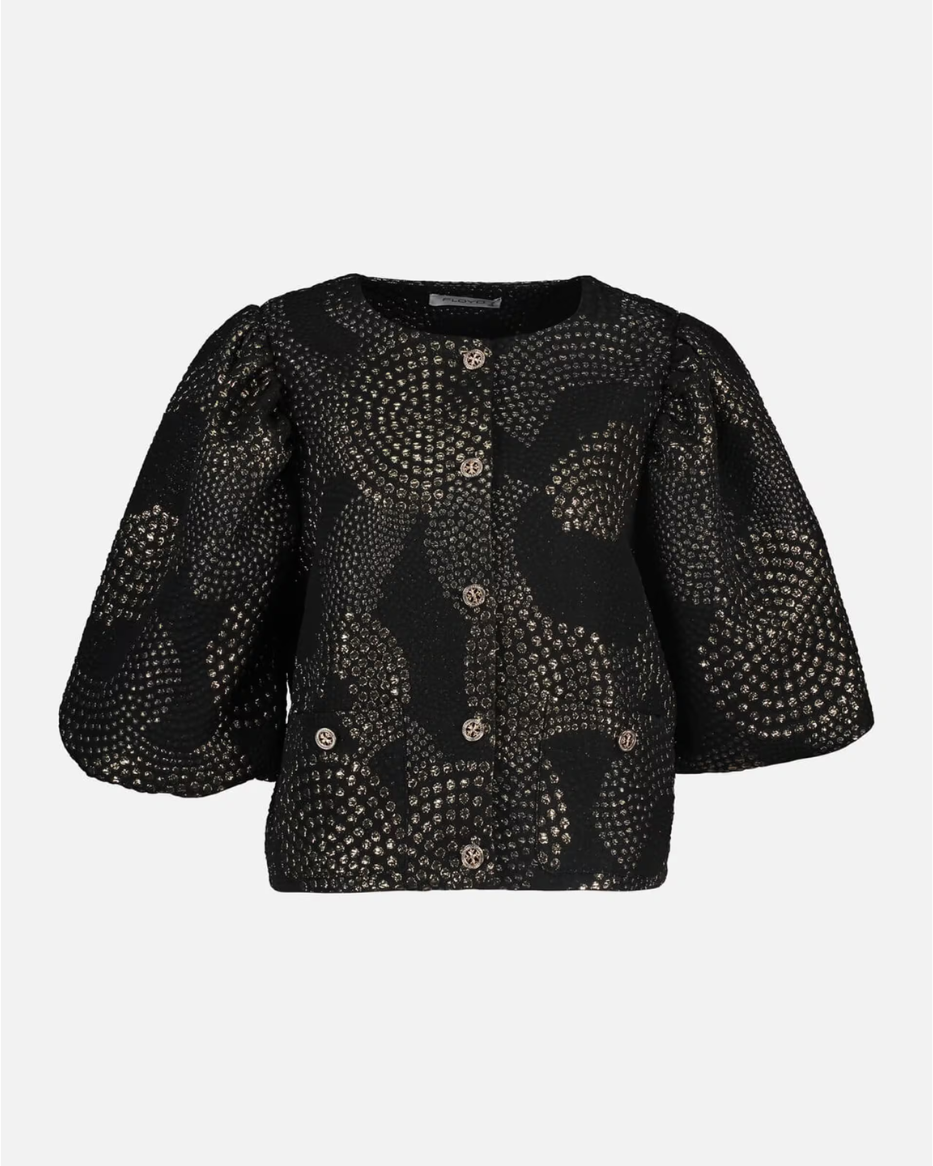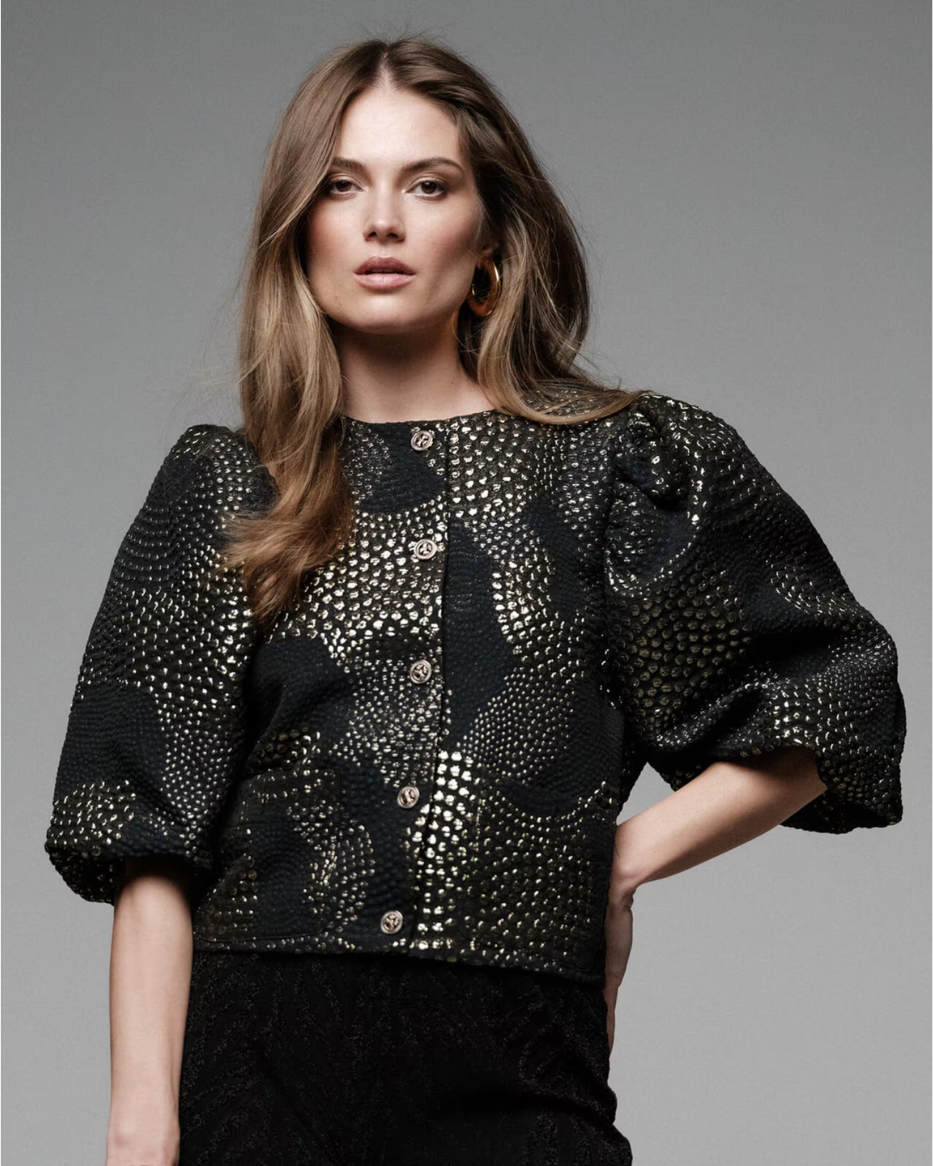 Sophina er en unik statement-topp som kombinerer det beste fra topp og jakke i ett eksklusivt design. Laget i et glitrende tekstil som fanger lyset på en sofistikert måte, med dekorative knapper i front som gir et luksuriøst preg. De små, funksjonelle lommene og de voluminøse ermene tilfører moderne detaljer og en elegant dramatikk. Knappene kan åpnes for en jakke-inspirert stil, mens den rette passformen gir en flatterende silhuett.