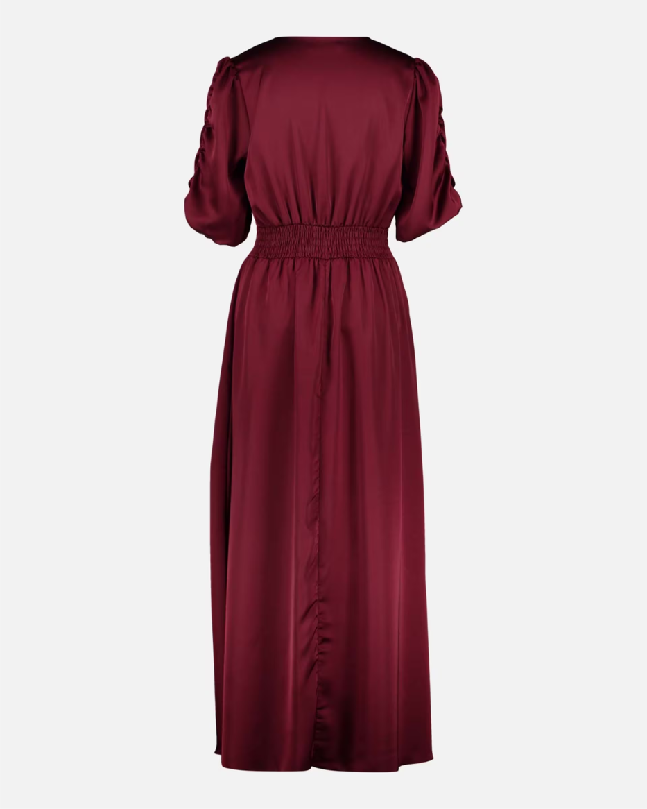 Strål med stil i Emmeli maxikjole, en eksklusiv kjole i glansfull sateng som kombinerer eleganse og femininitet. Den dype V-halsen og markerte midjen foran fremhever figuren, mens elastisk strikk i ryggen sørger for en flatterende passform. De delikate draperingene på ermene gir et sofistikert preg og tilfører kjolen et luksuriøst uttrykk.