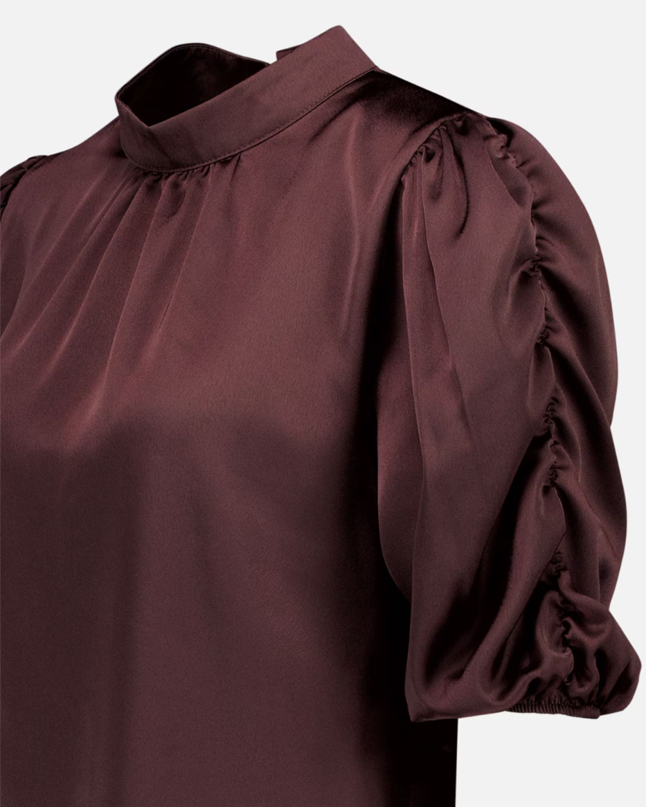 Emmeli-blusen kombinerer klassisk eleganse med moderne detaljer i et eksklusivt satengstoff som gir en vakker glans og et luksuriøst fall. De delikate draperingene på ermene tilfører et feminint preg og skaper en flatterende silhuett, mens de to små knappene i nakken gir en sofistikert åpning bak.