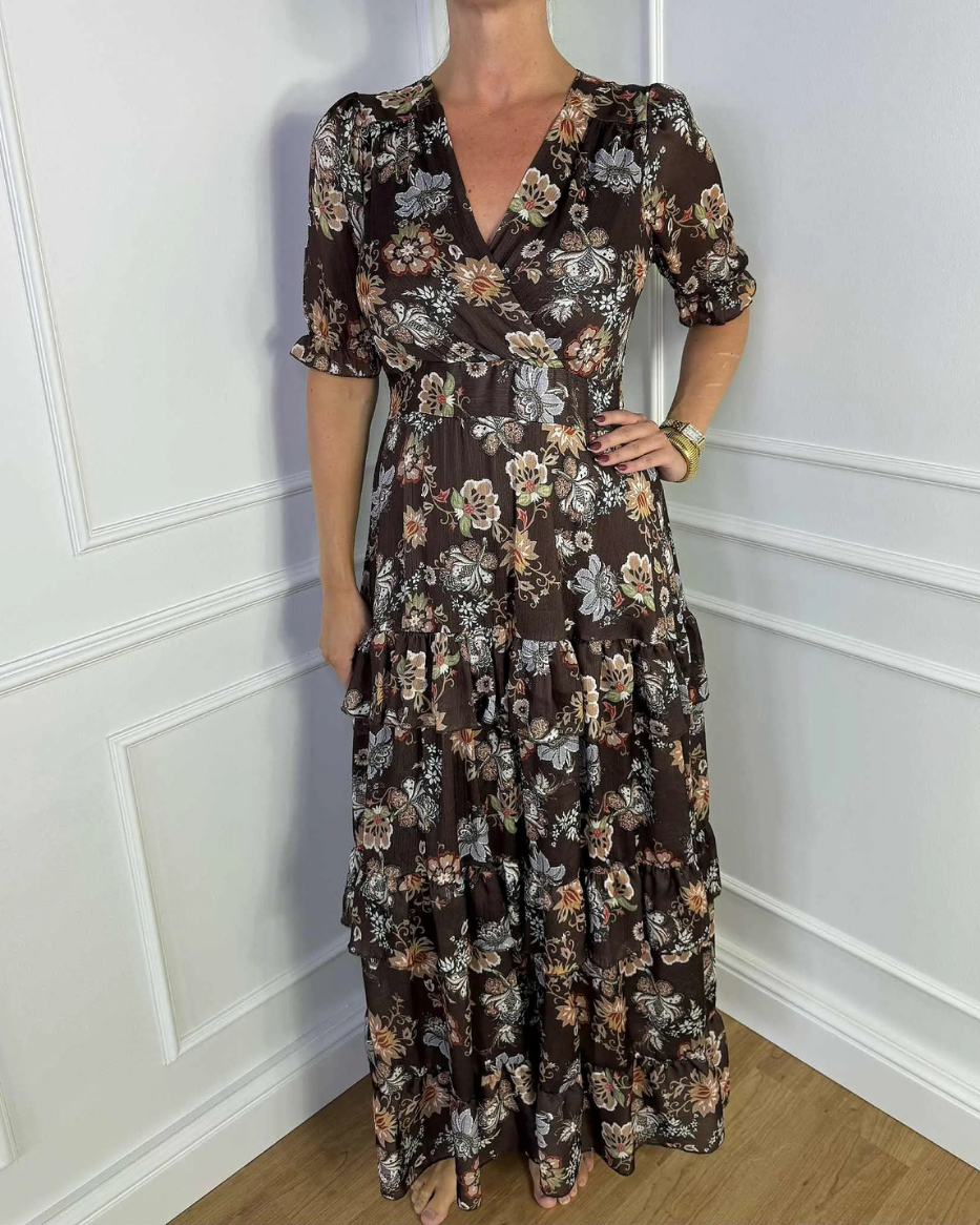 Amora-kjolen er en lang, feminin kjole i delikat chiffon med svart bunnfarge og nydelig blomsterprint. Den har en ledige overdel med omslag og flatterende V-hals, som gir et elegant uttrykk.
