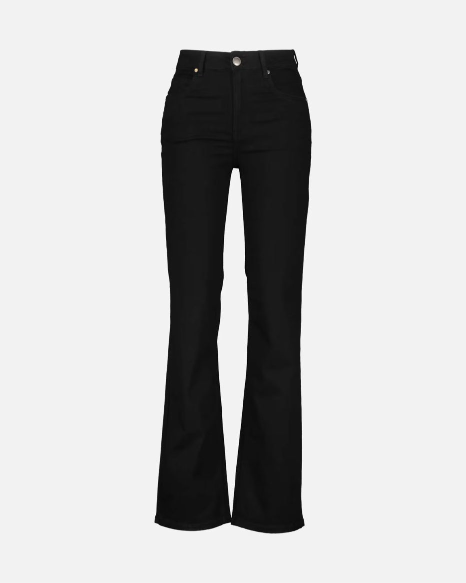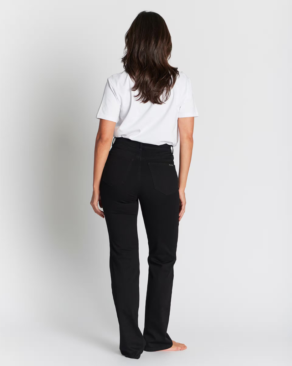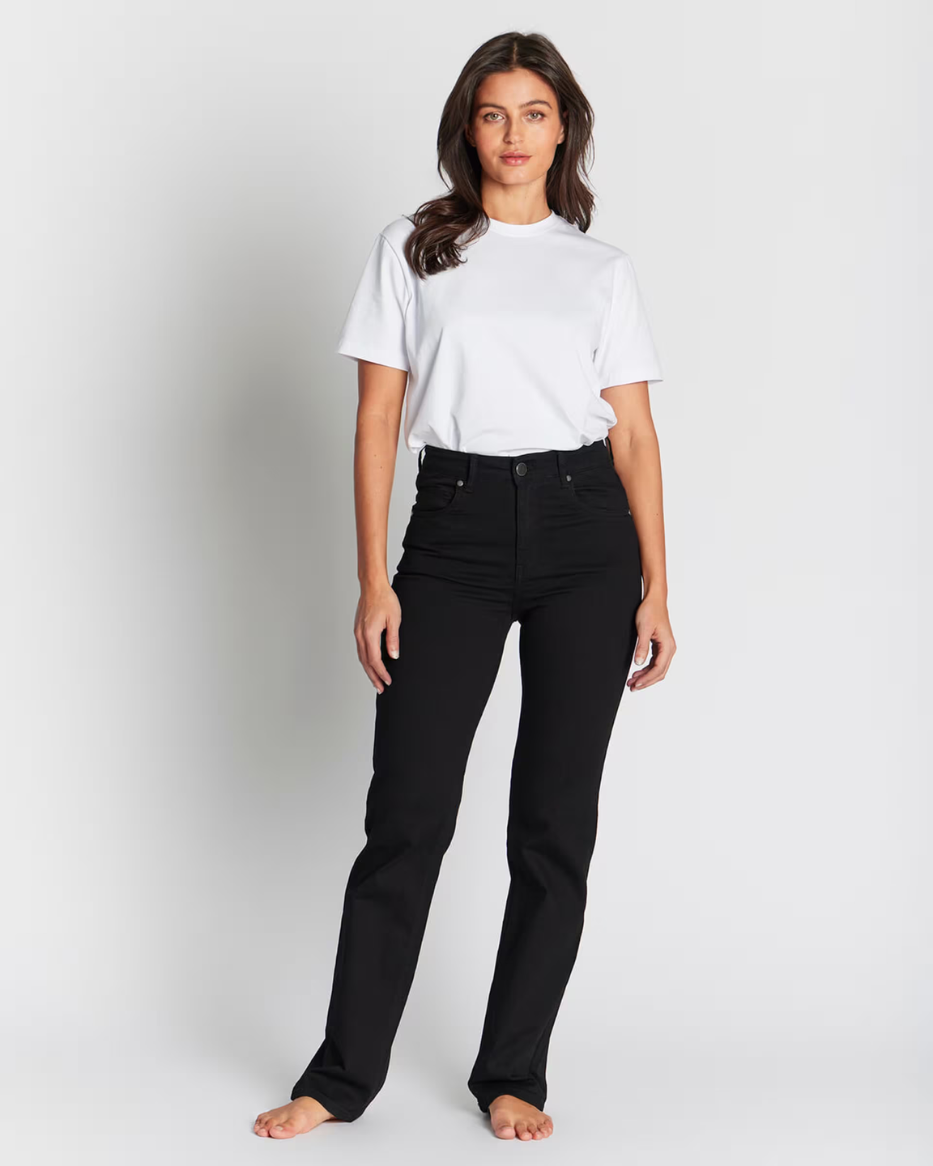 Myk jeans med ekstra høyt liv og rett passform som gir en klassisk og tidløs silhuett. Baklommene er plassert midt på rumpa for en flatterende form, mens den V-formede sømmen over rumpa fremhever figuren på en naturlig måte.