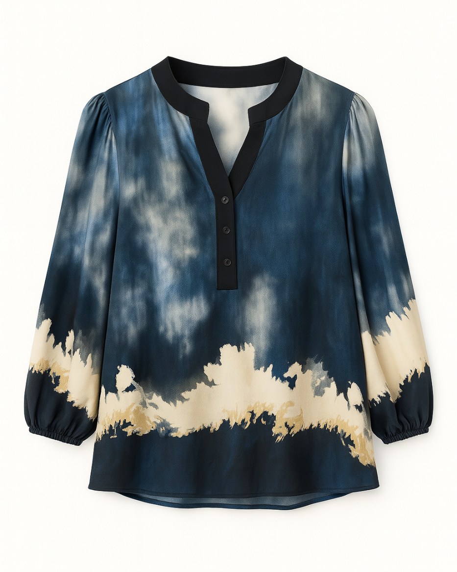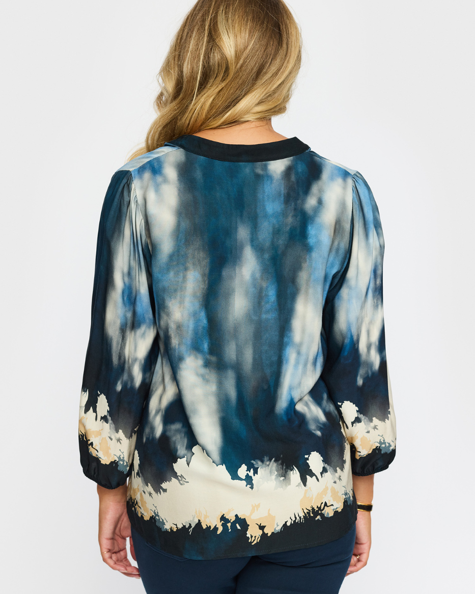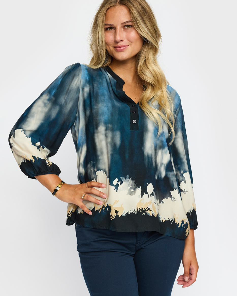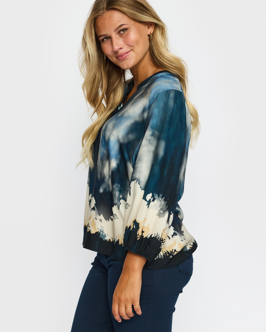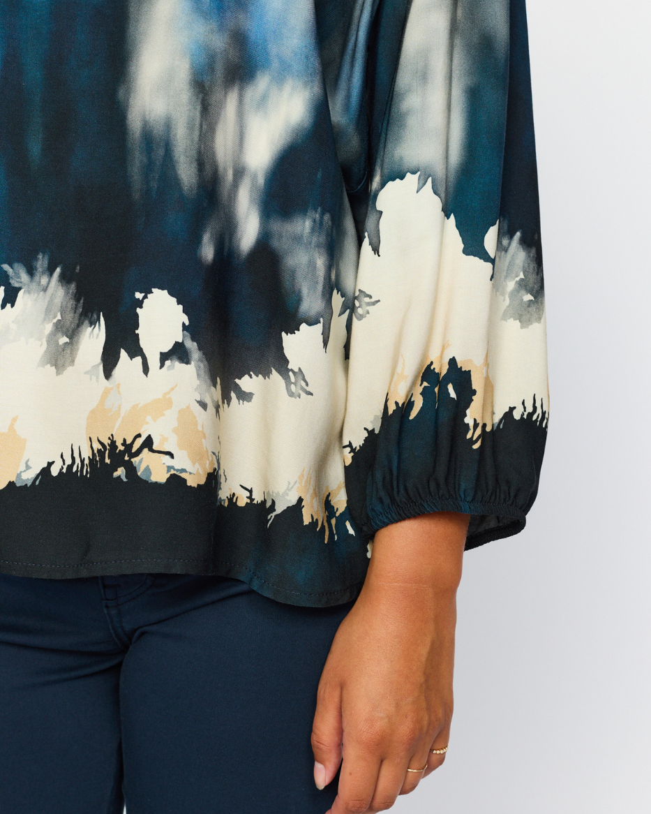 Eline er en lett og elegant bluse med V-hals og stolpeknepping foran, laget i et stoff med unikt mønster som gir blusen et friskt og moderne uttrykk. De lange puff-ermene med strikk i kanten tilfører et feminint preg samtidig som de sikrer komfortabel passform.