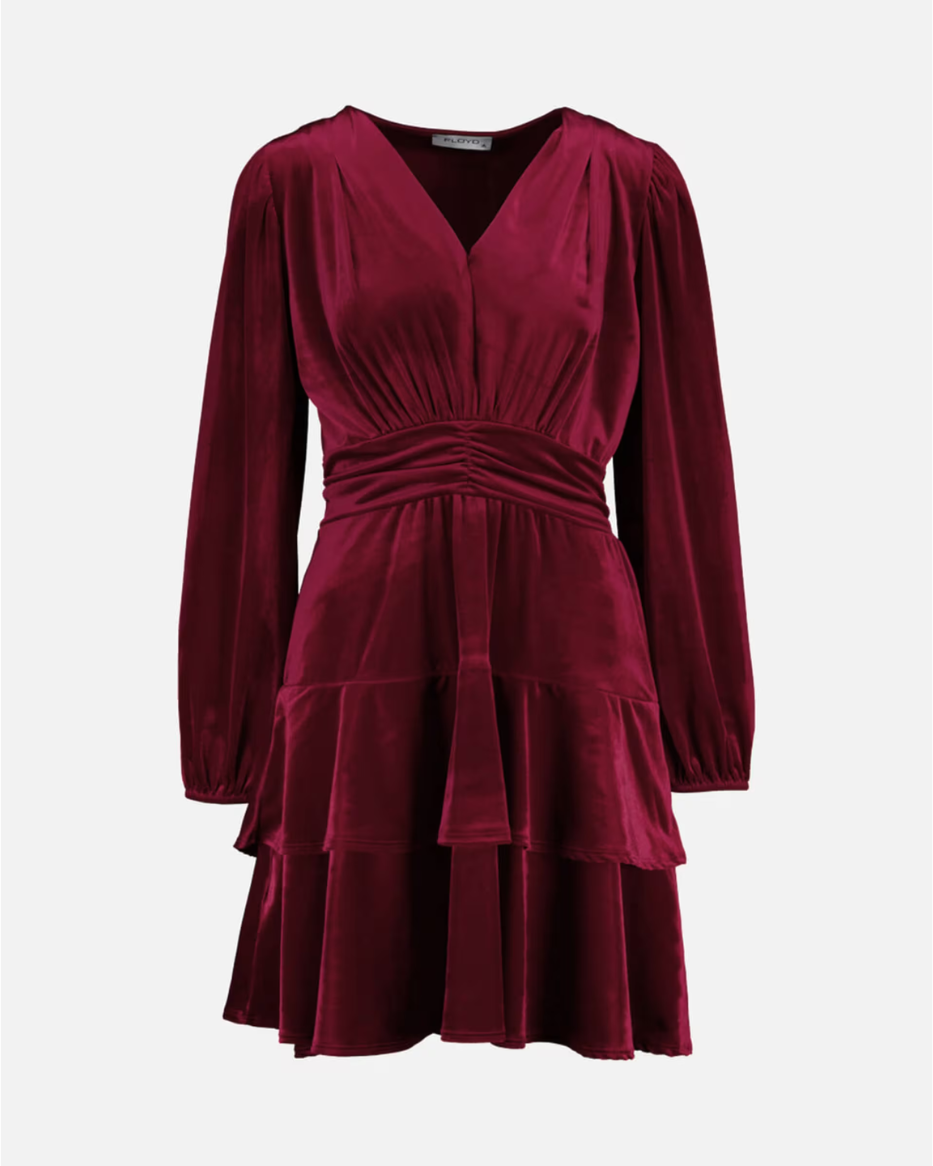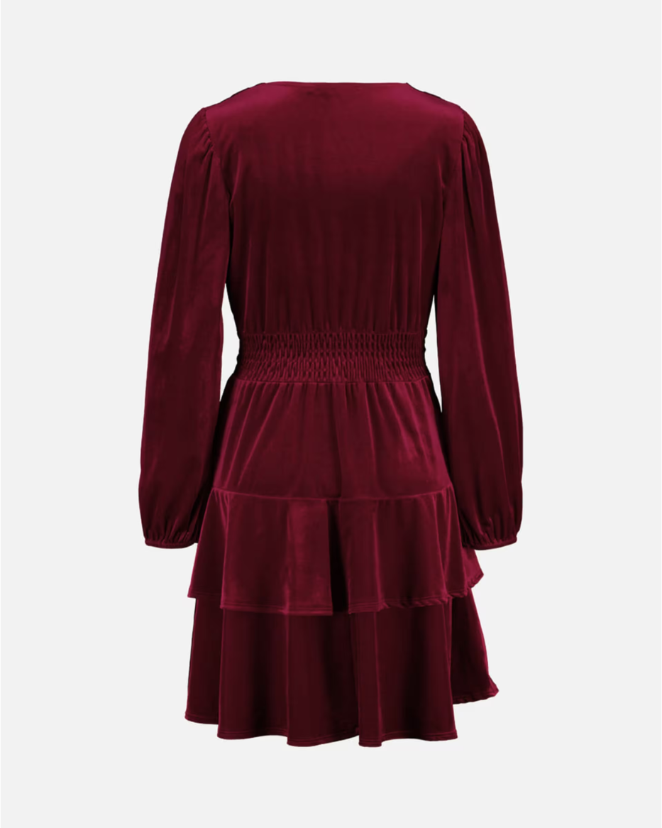 Denne nydelige kjolen i myk velour kombinerer luksus, komfort og tidløs stil. Den har en vakker glans som gir et eksklusivt uttrykk, mens den feminine V-utringningen og det brede midjepartiet fremhever figuren på en elegant måte. Strikken i ryggen sørger for en behagelig og fleksibel passform som sitter perfekt.