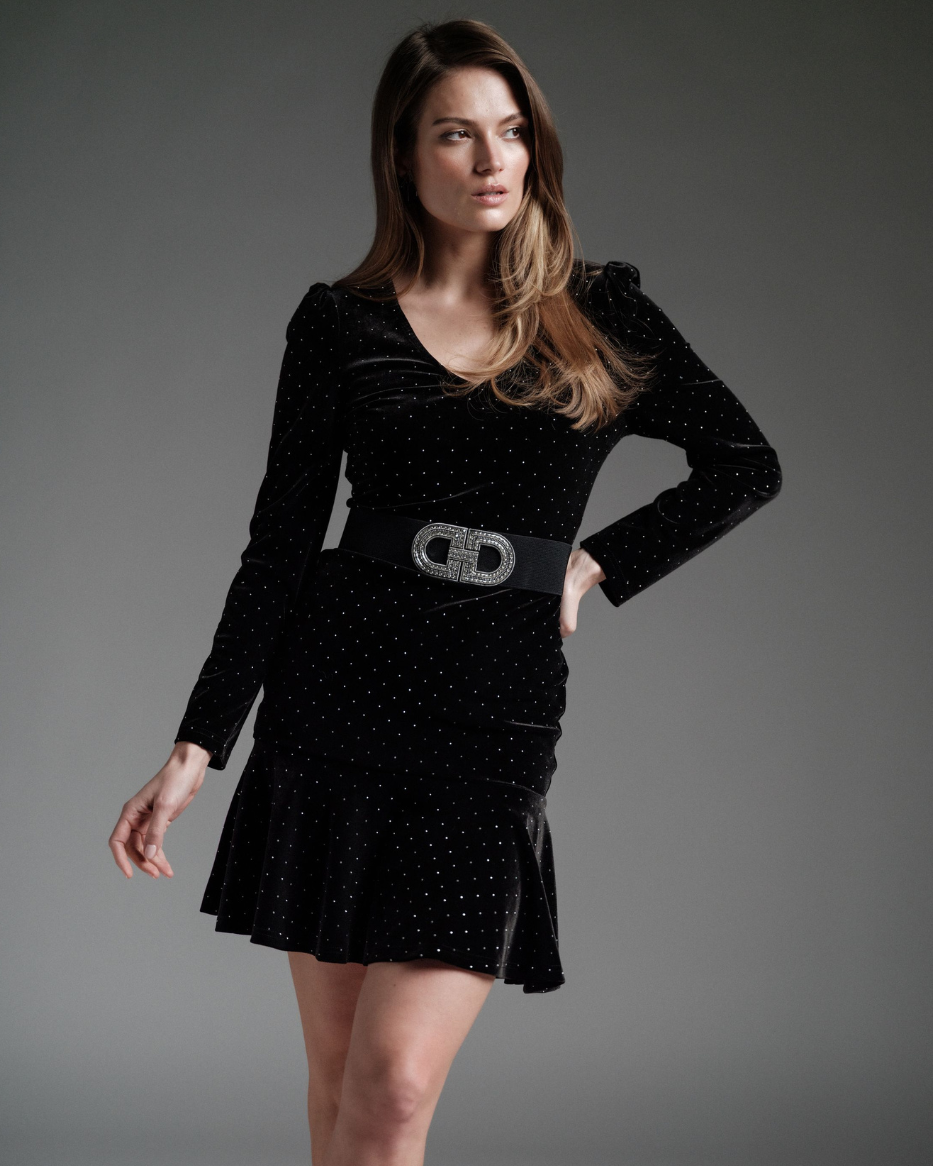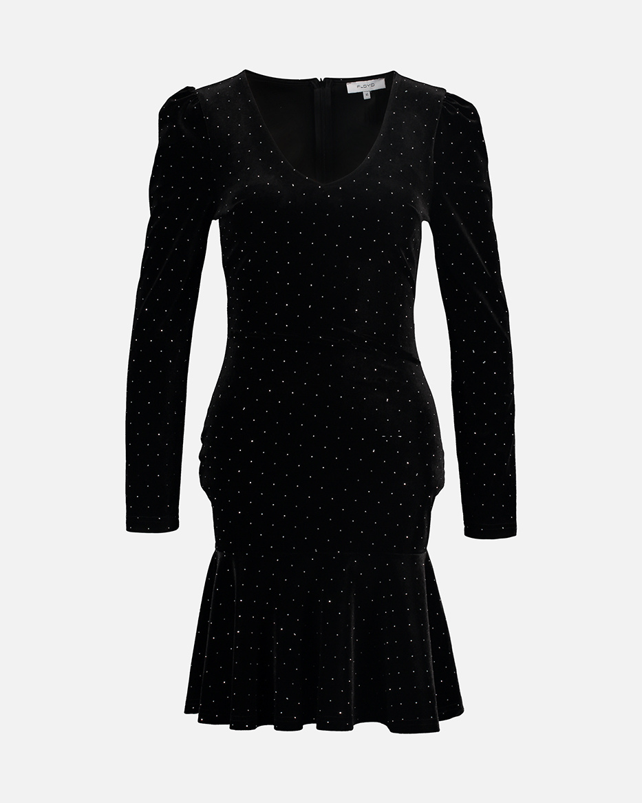 Denne vakre fløyelskjolen med diamanter er laget for å glitre! De små diamantene som er drysset over hele kjolen fanger lyset og gir et eksklusivt uttrykk – perfekt til sesongens festligheter.