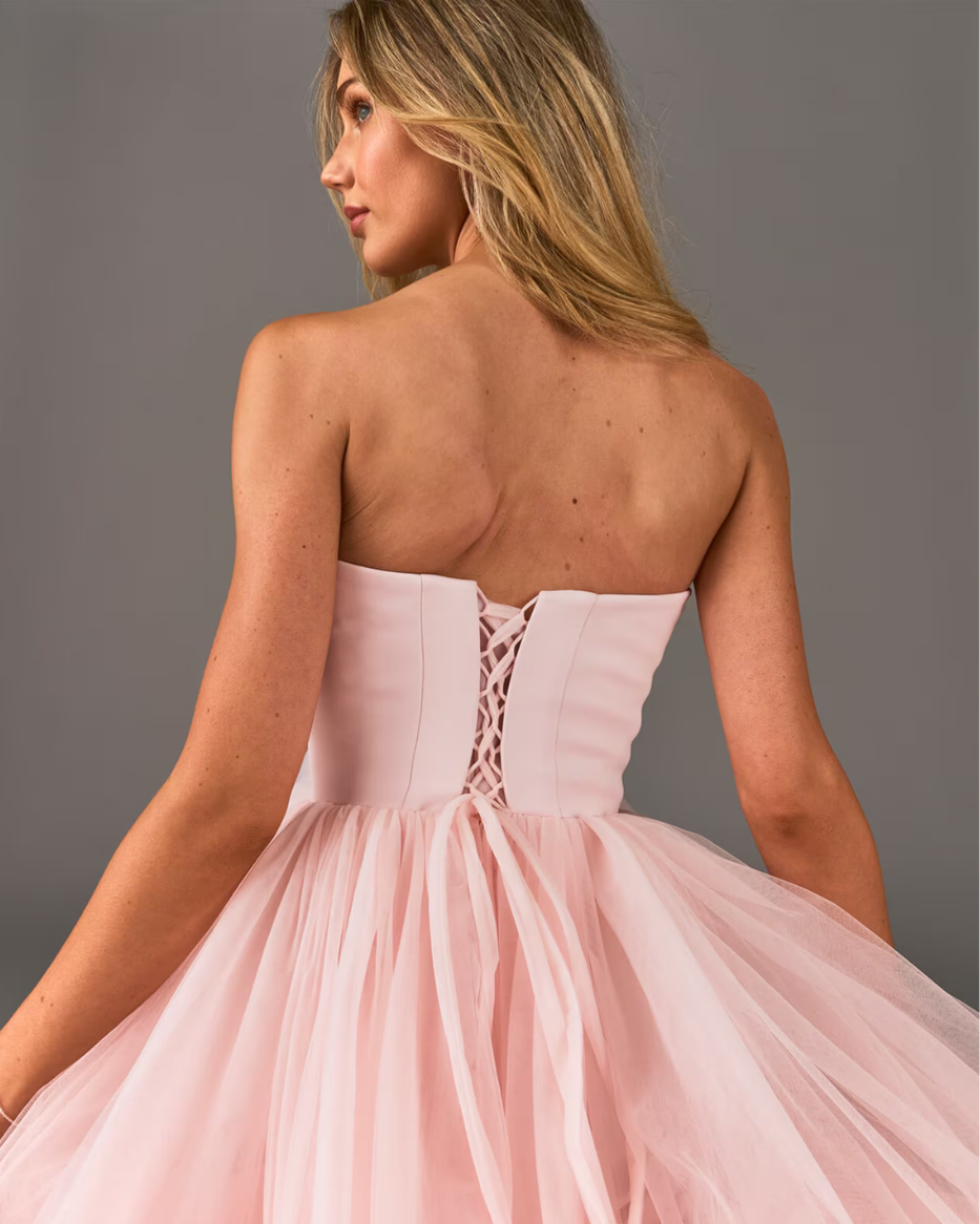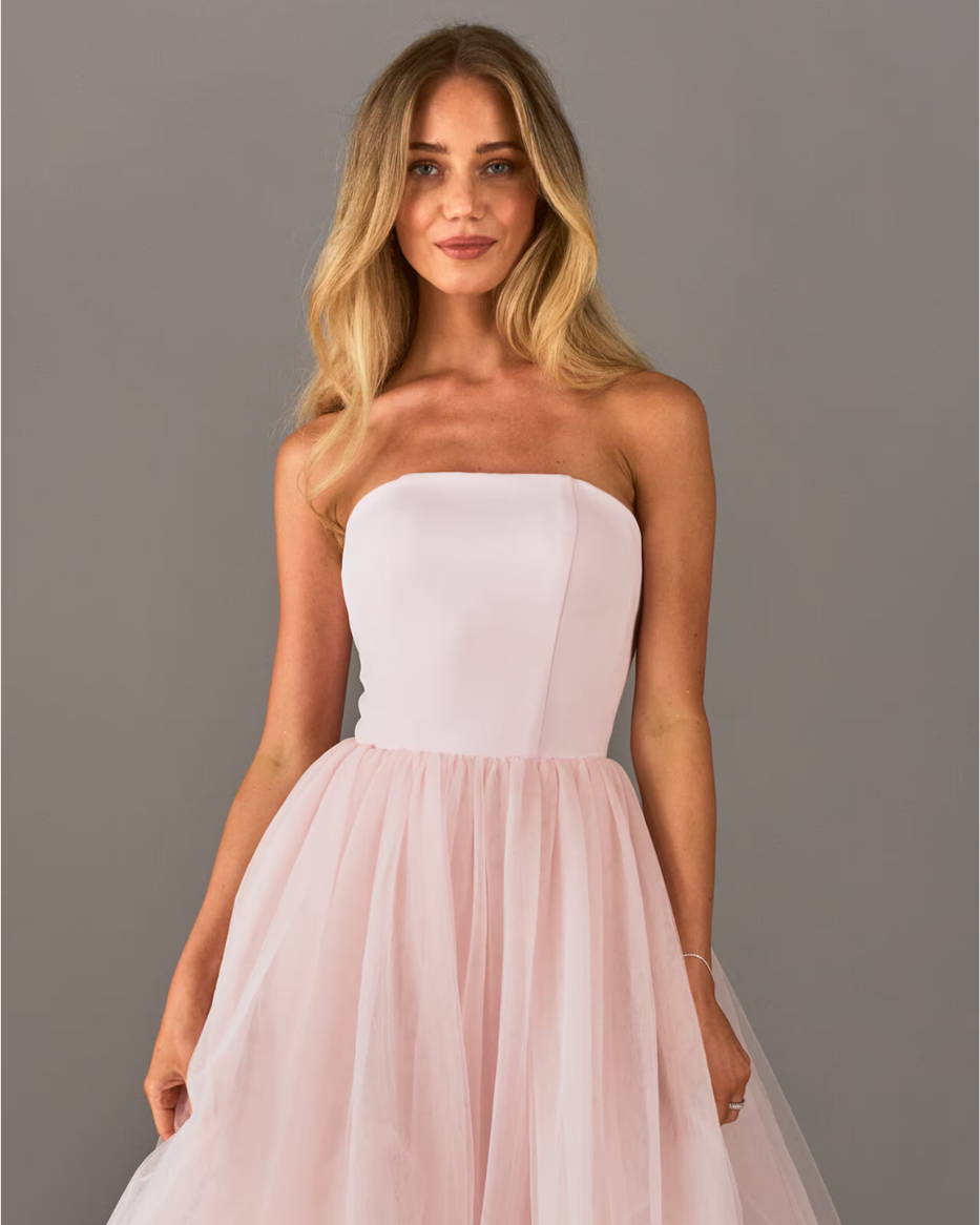 Overdelen er stroppløs med spiler som holder fasongen perfekt gjennom hele kvelden, og den justerbare korsettlukkingen bak gjør at kjolen sitter som skreddersydd. For deg som ønsker ekstra støtte, følger det med avtakbare stropper som enkelt kan festes. Skjørtet har glidelås i siden, som gir en sømløs og flatterende passform.