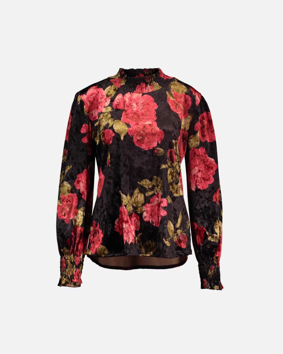 Juliet Rose er en nydelig og feminin bluse i myk velour med et vakkert rosemønster som gir et romantisk og tidløst preg. Blusen har høy hals med elastisk smock som gir en behagelig og fleksibel passform, samtidig som den skaper et elegant uttrykk. De lange ermene har en lett fasong og avsluttes med brede mansjetter i samme elastiske smock, som gir en pen og sofistikert avslutning.