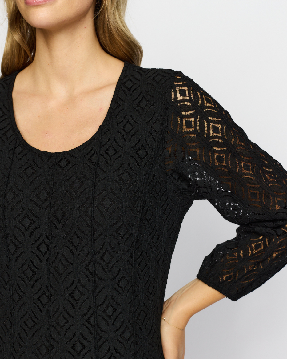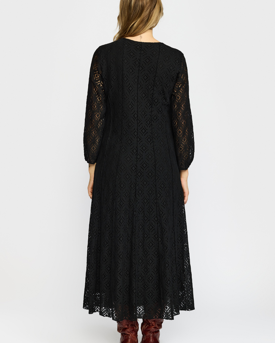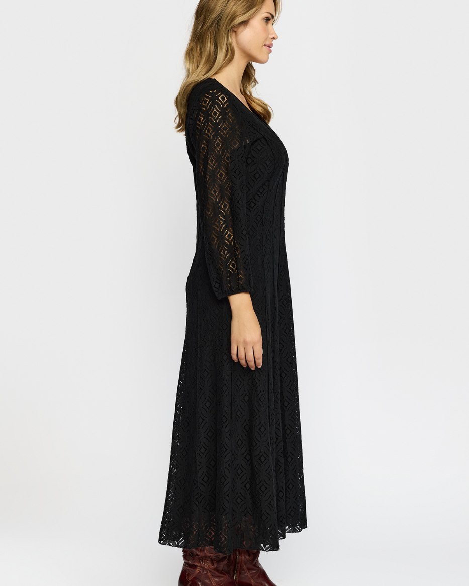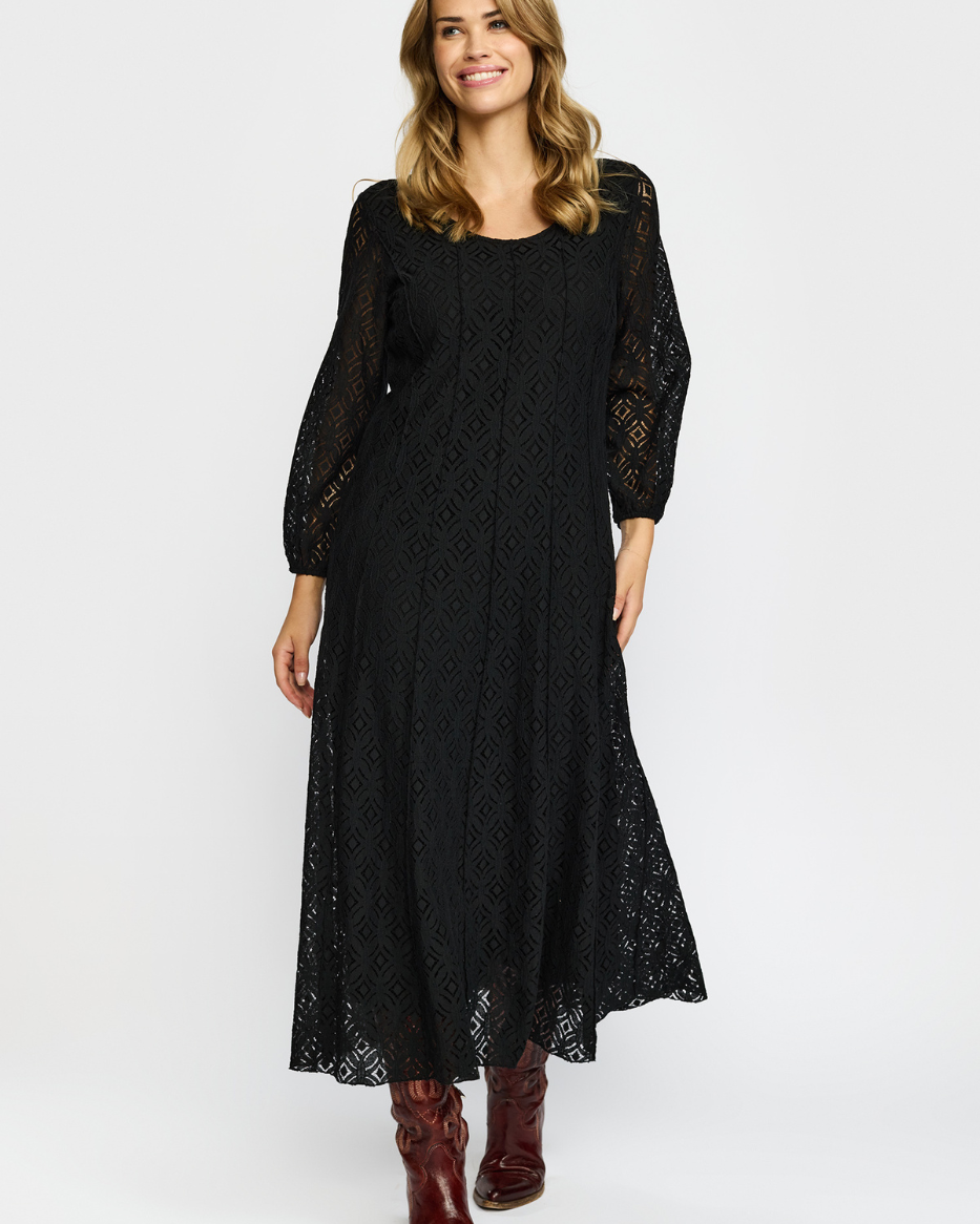 Rigmor er en elegant midi-kjole i blonde med rund hals og lange ermer. Kjolen har lange panelsømmer som gir en flatterende og god passform. Ermene er ikke foret, noe som gir et lett og delikat uttrykk. Perfekt for festlige anledninger eller når du vil ha et sofistikert antrekk.