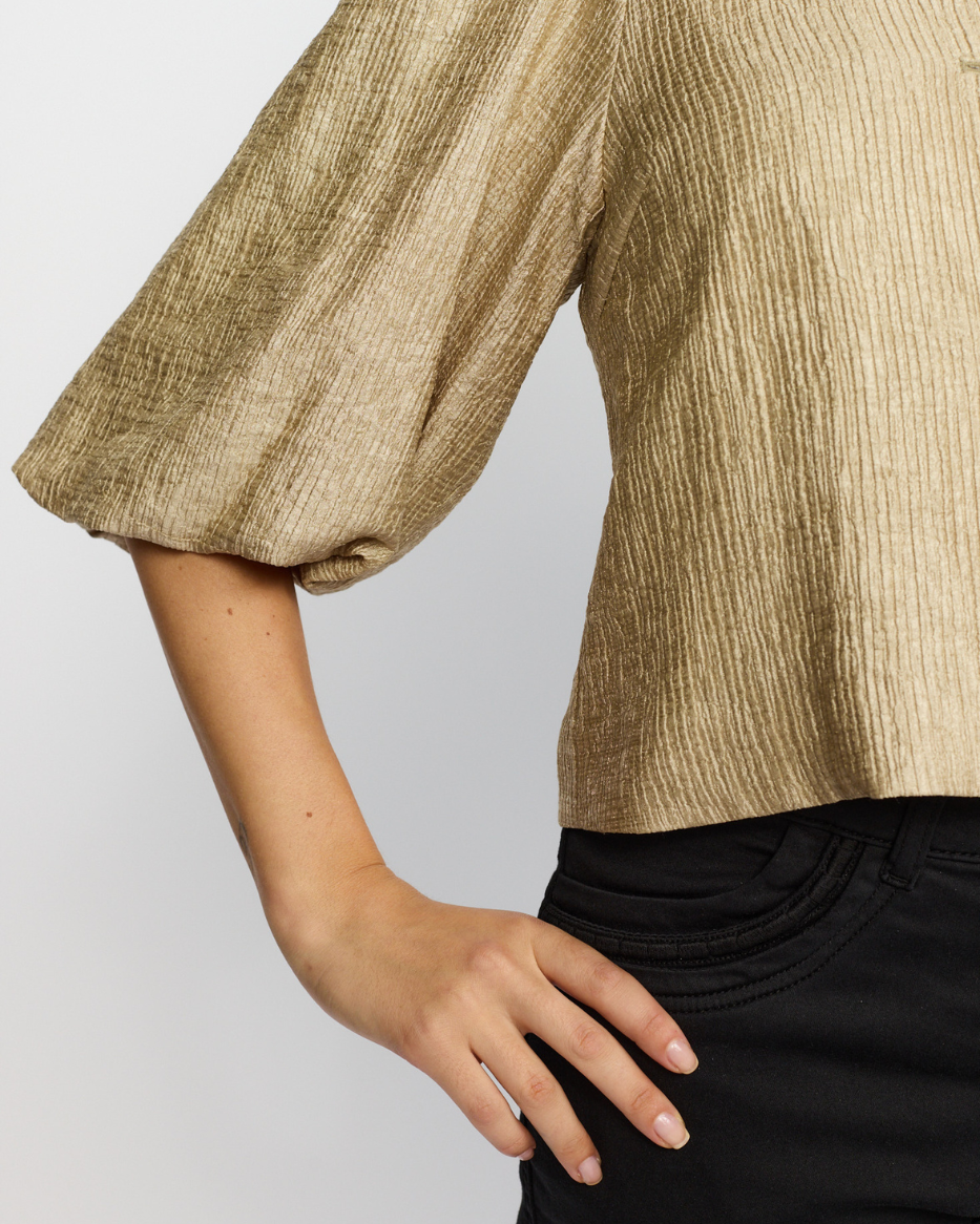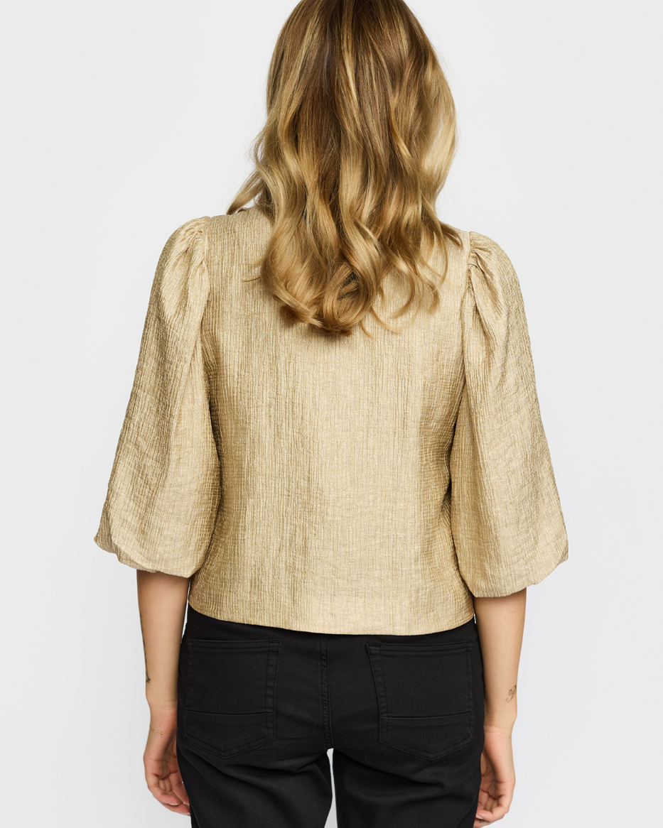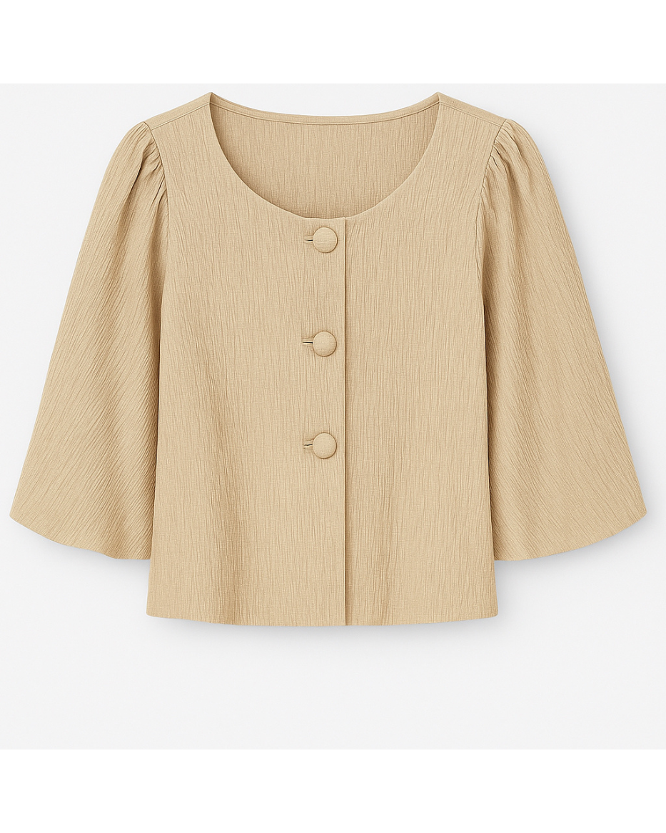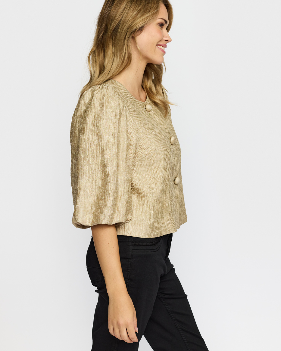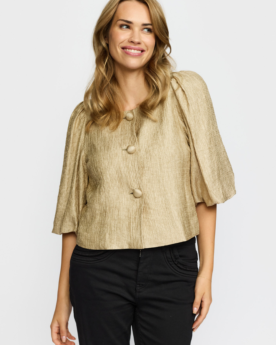 Mille er en kort, foret jakke med lett kreppet struktur og subtil glans i stoffet. Jakken har rund hals, trekte knapper til lukning og korte ermer med en søt ballong- og puff-effekt. Den kan brukes både som jakke og topp, og det lette foret gjør den perfekt for kjøligere dager.