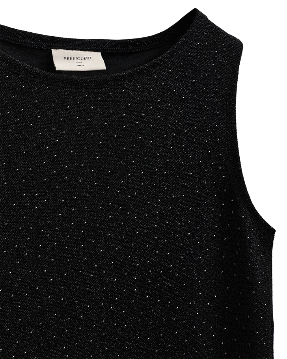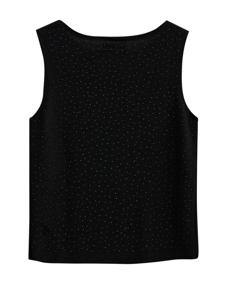 Denne singleten er full av glam! Laget i et elastisk glittermateriale som sitter behagelig og gir et smooth, festklart uttrykk. Rund hals og limte diamanter i ton-i-ton gir en luksuriøs finish uten å være “too much”. Perfekt alene til dressbukser, skinn eller skjørt – og super under blazer for en chic partylook.